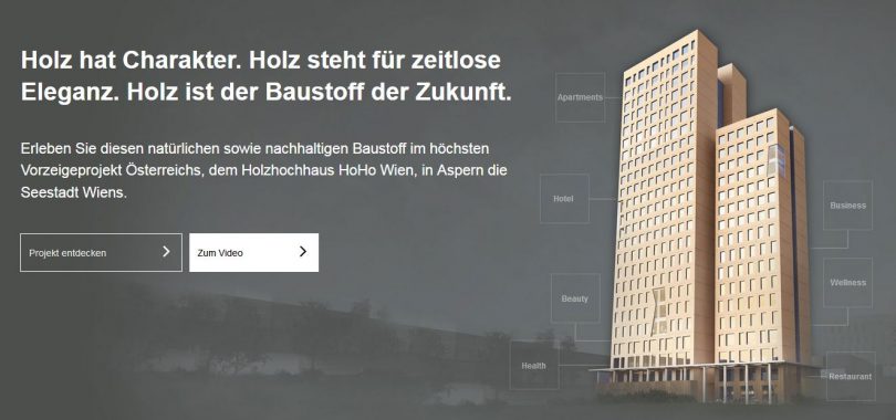 „Das HoHo-Holzhochhaus von RLP Rüdiger Lainer+Partner ist mit seinen 24 Etagen zur Zeit das höchste Gebäude seiner Art weltweit. Wichtiger aber ist sein urbaner Gebrauchswert. Der Turm bildet ein integratives Element im neuen Wiener Quartier Seestadt Aspern. Nach Fertigstellung – ab 2018 – sollen dort Büros, serviced Apartments, ein Hotel und Wellness-Bereiche eingerichtet werden. Voraussetzung für diese Mischung ist ein innovatives Konstruktionssystem, das für höchste Flexibilität der Nutzflächen sorgt: HoHo Wien zeigt im Vergleich zum reinen Holzbau die Vorzüge der Holzhybridbauweise. Aussteifende Beton-Kerne dienen der Erschließung. Angedockt ist die Holzbaukonstruktion für die offene Gebäudenutzung. Der Holzbauanteil ab EG kann mit 74% beziffert werden.“ (von http://www.lainer.at/hochstes-holzhaus-der-welt/?sc=4)