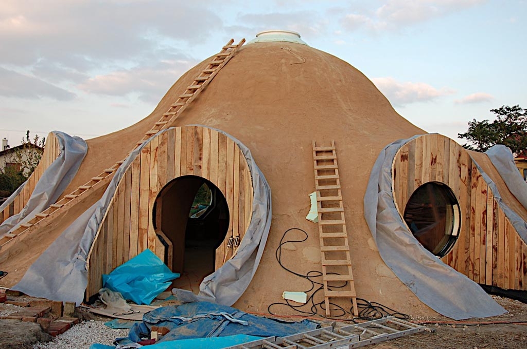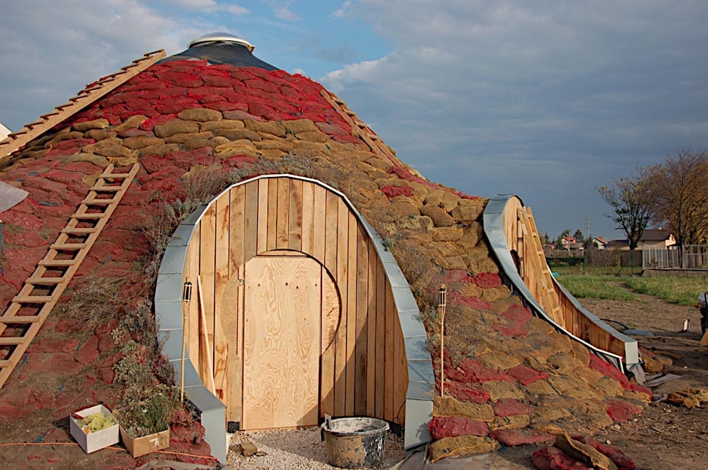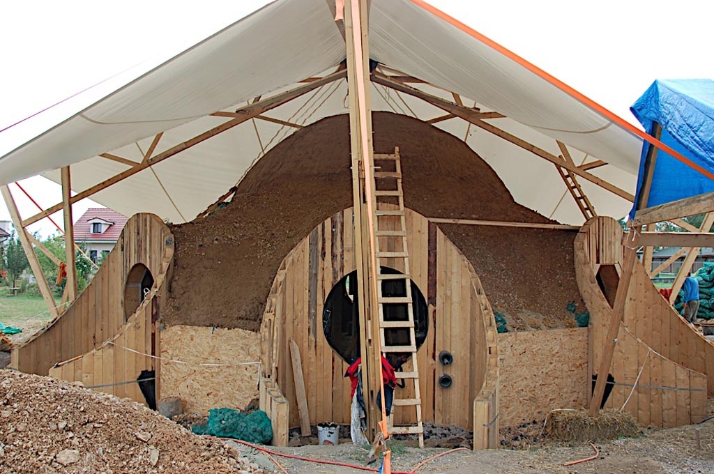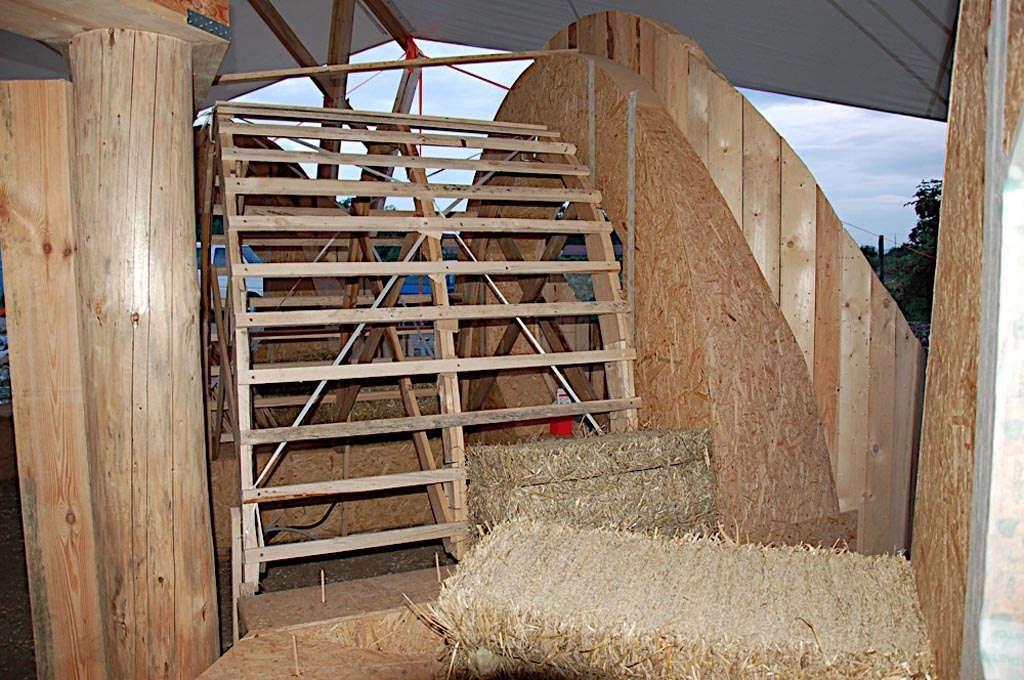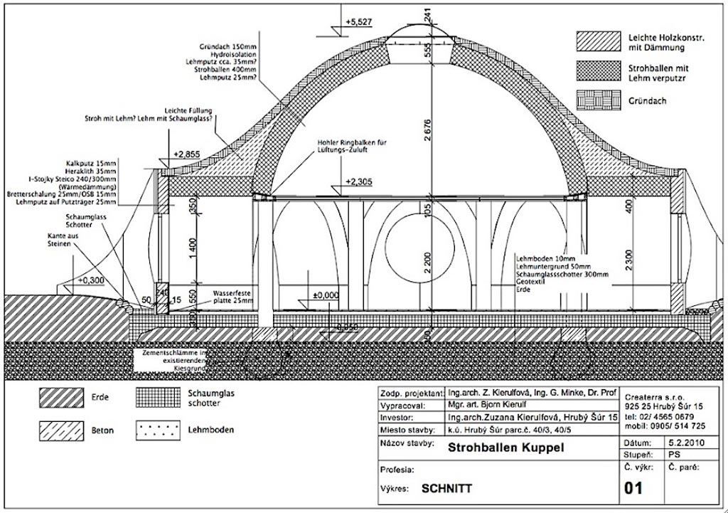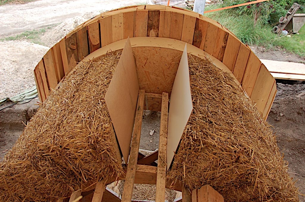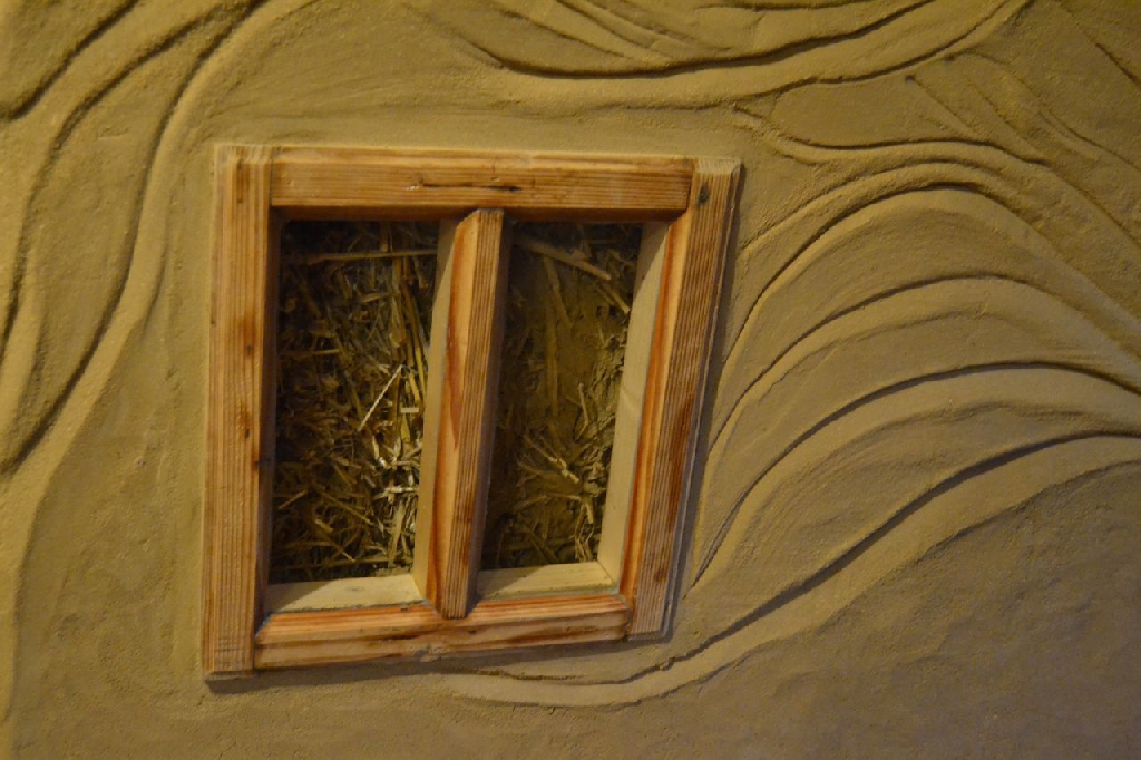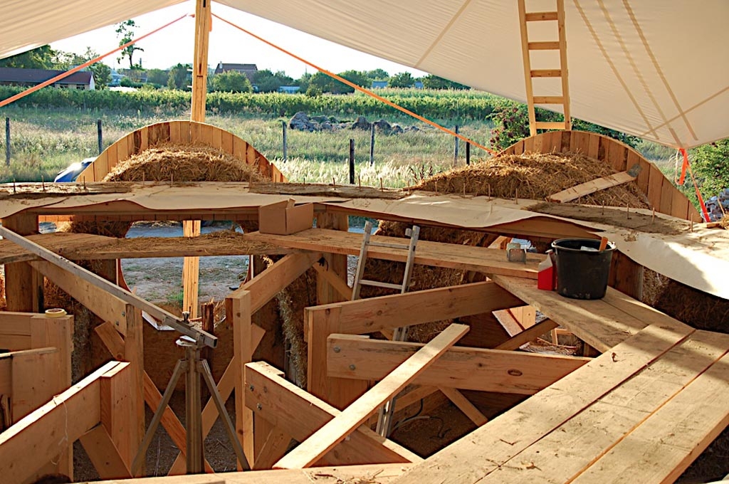 Nach Plänen von Prof. Gernot Minke und Arch. Zuzana Kierulvova, die auch Netzwerkerin (ArTUR) in der Slovakei ist entstand dieser Dom auf 5 lasttragenden Strohballen-Gewölben. Dabei wurde zuerst auf einem Schaumglasfundament eine OSB-Box mit Konstruktionsholz für die Fenster und Eingangstüre errichtet, dann tragende Rundhölzer, auf der die obere Kuppel ruht und danach wurden die Wände lasttragend als Gewölbe aufgemauert und mit Spannbändern vertikal und horizontal komprimiert. Dazu wurden die Ballen leicht konisch zugeschnitten. An der Innenseite wurde anschließend mit ca. 5-6 cm Lehm verputzt, an der Außenseite auf einer Lehm-Ausgleichsschicht eine EPDM-Teichfolie mit einem Gründach montiert. Bauphysikalisch also ein Wahnsinn, da außen eine Dampfsperre die Diffusion unterbindet. In der Realität aber funktioniert das prächtig. Bei einem Feuchtetest, zu dem auch das asbn anläßlich unseres Leonardo-Projektes eingeladen wurde, wurden an 2 Stellen der Kuppel die Folie aufgeschnitten und Messungen durchgeführt. Das Resultat war absolut überraschend: das Feuchtemessgerät zeigte an keiner Stelle – weder direkt unter der Folie noch im Stroh oder in der Lehmschicht – mehr als 10% rel. Feuchte an. Erklärbar ist das nur durch den Lehm, der bereits an der Innenseite der Wände so viel Feuchte anzieht, dass keine Feuchtigkeit in Form von Diffusion mehr in die Wand kann. Es lebe der Lehmputz!