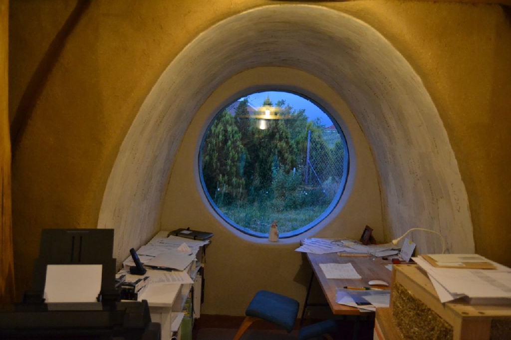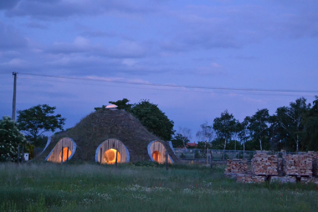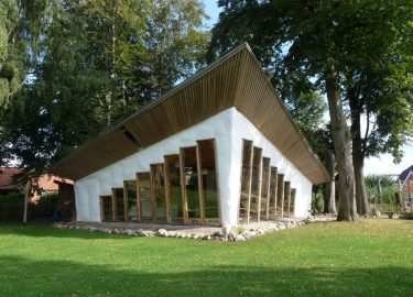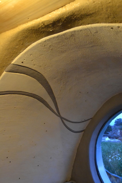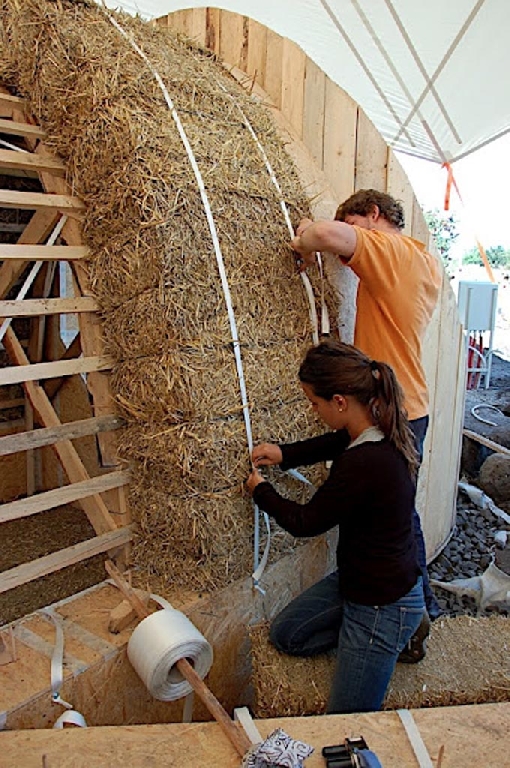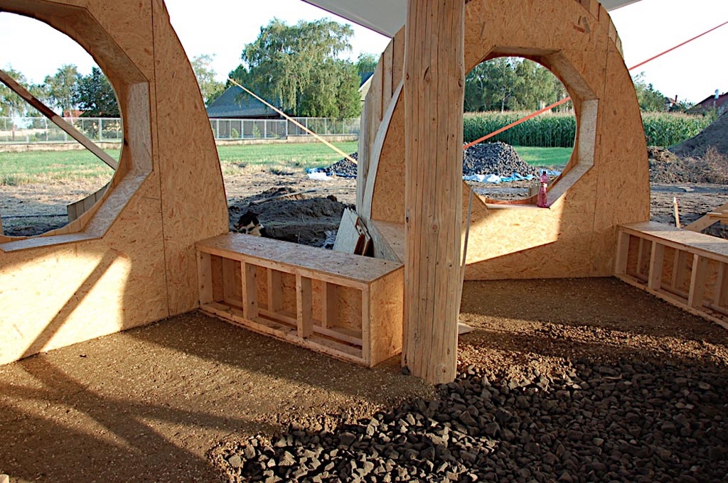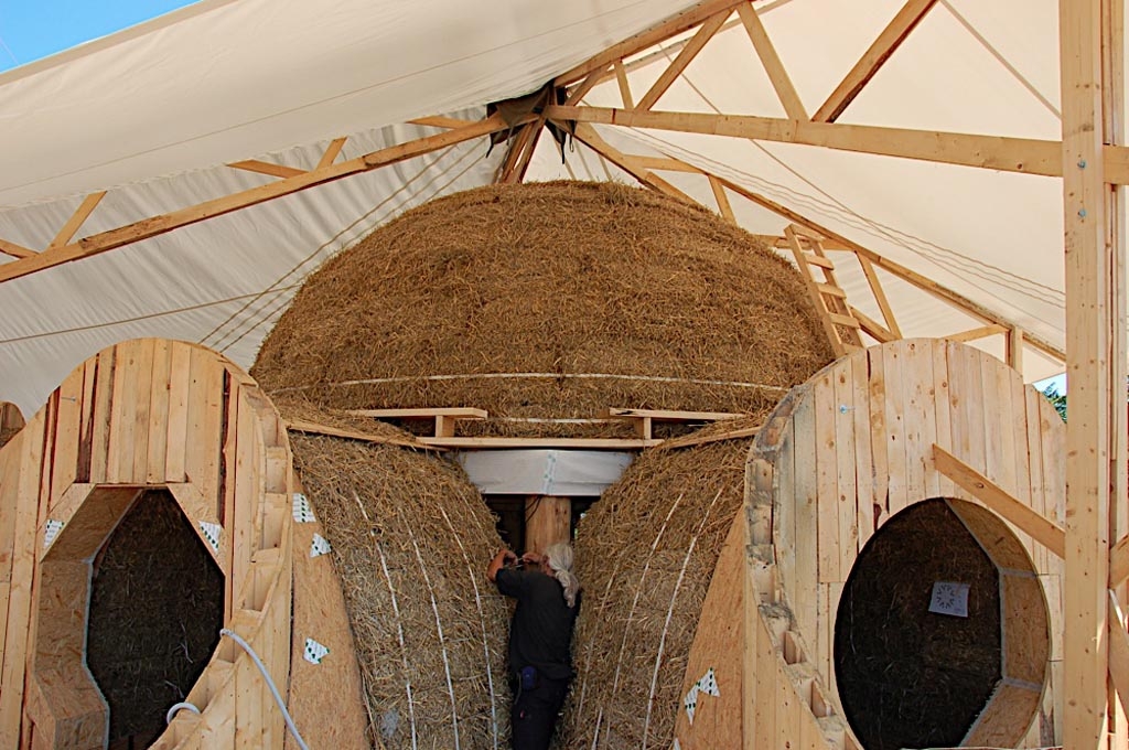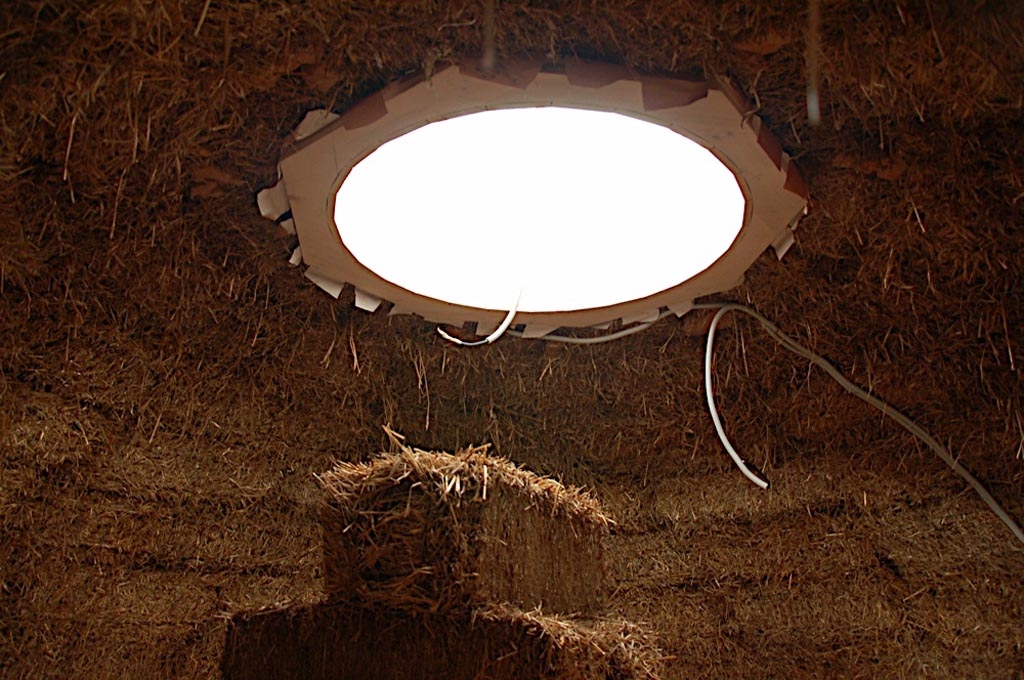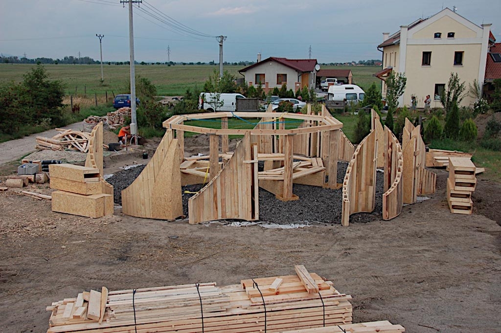 Nach Plänen von Prof. Gernot Minke und Arch. Zuzana Kierulvova, die auch Netzwerkerin (ArTUR) in der Slovakei ist entstand dieser Dom auf 5 lasttragenden Strohballen-Gewölben. Dabei wurde zuerst auf einem Schaumglasfundament eine OSB-Box mit Konstruktionsholz für die Fenster und Eingangstüre errichtet, dann tragende Rundhölzer, auf der die obere Kuppel ruht und danach wurden die Wände lasttragend als Gewölbe aufgemauert und mit Spannbändern vertikal und horizontal komprimiert. Dazu wurden die Ballen leicht konisch zugeschnitten. An der Innenseite wurde anschließend mit ca. 5-6 cm Lehm verputzt, an der Außenseite auf einer Lehm-Ausgleichsschicht eine EPDM-Teichfolie mit einem Gründach montiert. Bauphysikalisch also ein Wahnsinn, da außen eine Dampfsperre die Diffusion unterbindet. In der Realität aber funktioniert das prächtig. Bei einem Feuchtetest, zu dem auch das asbn anläßlich unseres Leonardo-Projektes eingeladen wurde, wurden an 2 Stellen der Kuppel die Folie aufgeschnitten und Messungen durchgeführt. Das Resultat war absolut überraschend: das Feuchtemessgerät zeigte an keiner Stelle – weder direkt unter der Folie noch im Stroh oder in der Lehmschicht – mehr als 10% rel. Feuchte an. Erklärbar ist das nur durch den Lehm, der bereits an der Innenseite der Wände so viel Feuchte anzieht, dass keine Feuchtigkeit in Form von Diffusion mehr in die Wand kann. Es lebe der Lehmputz!