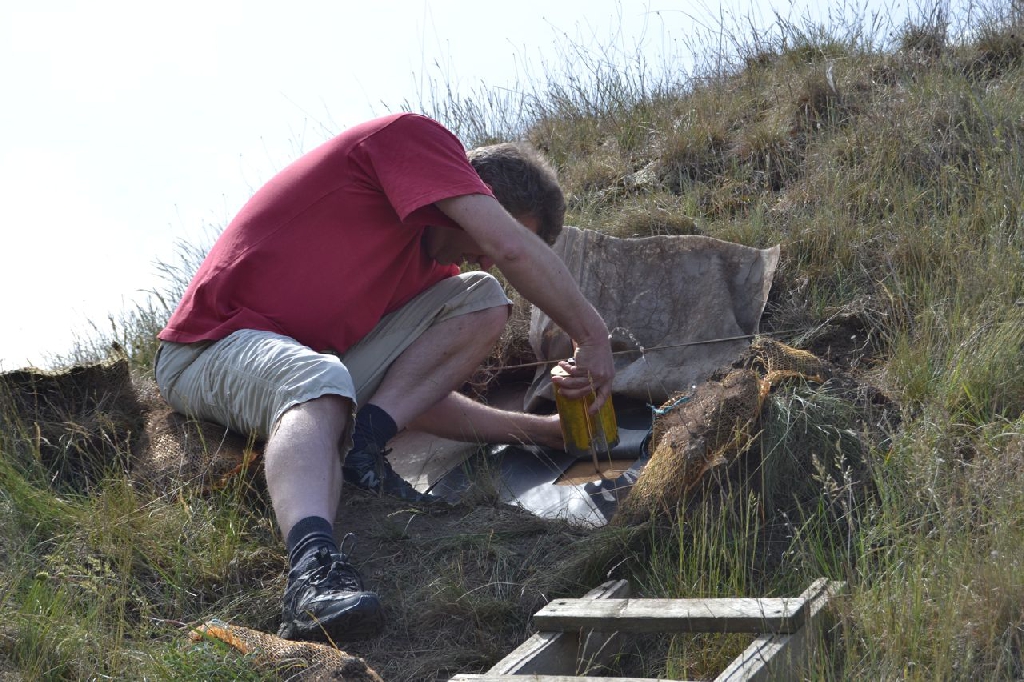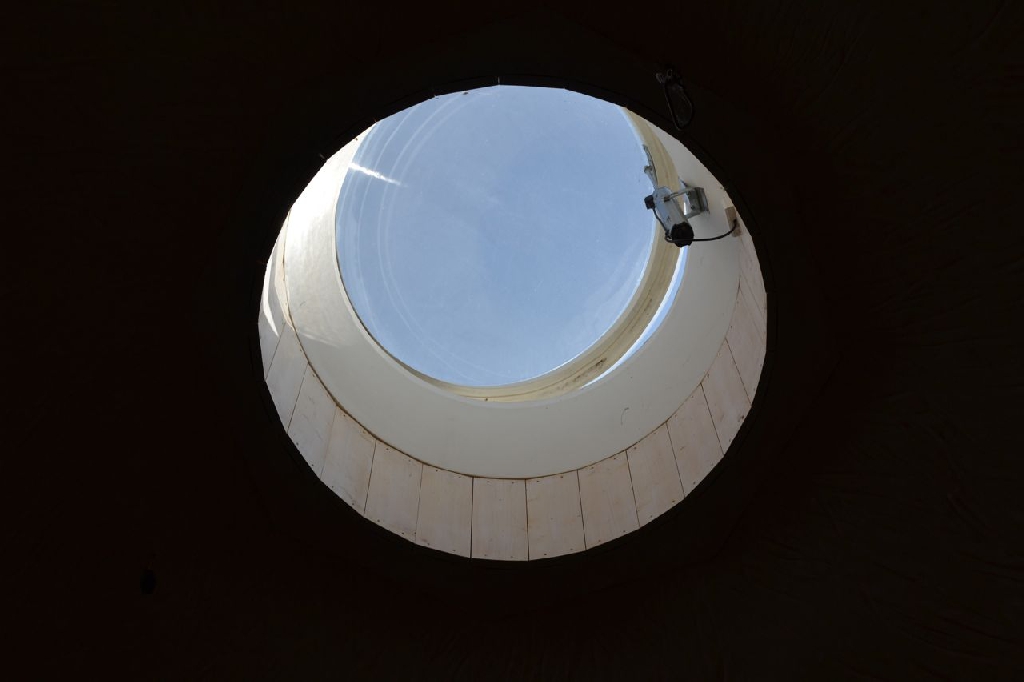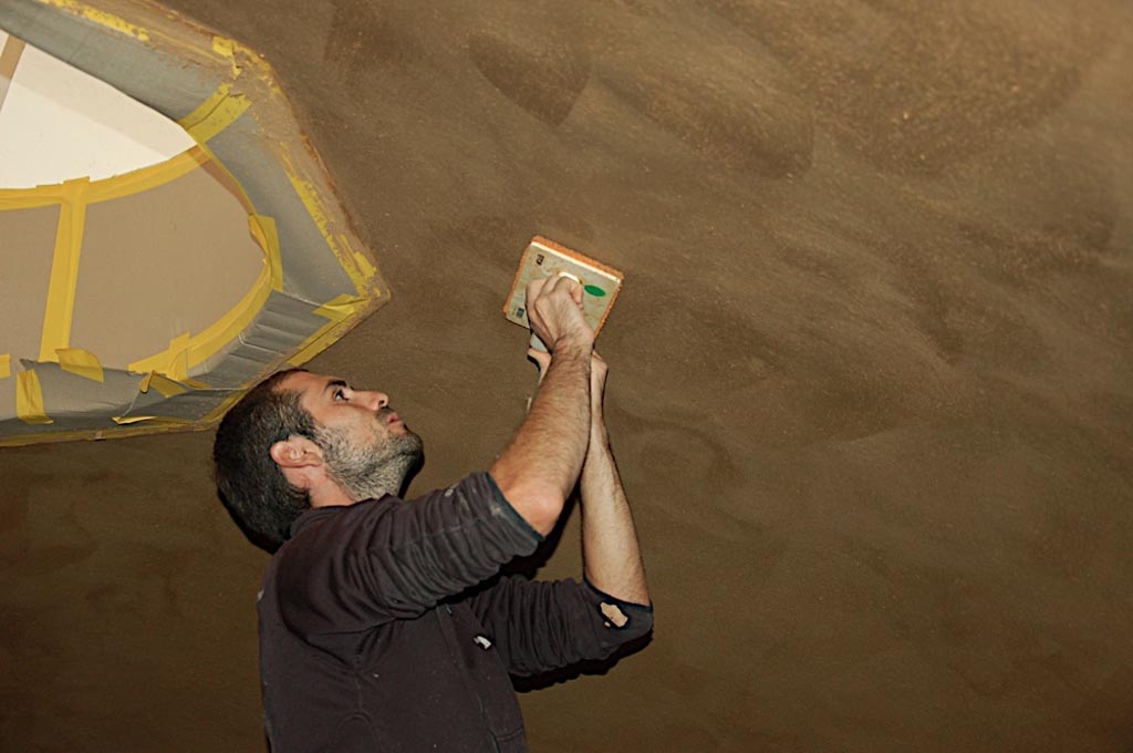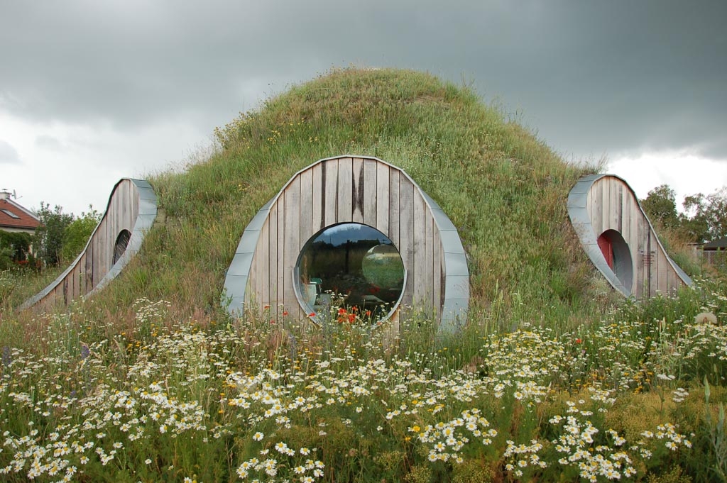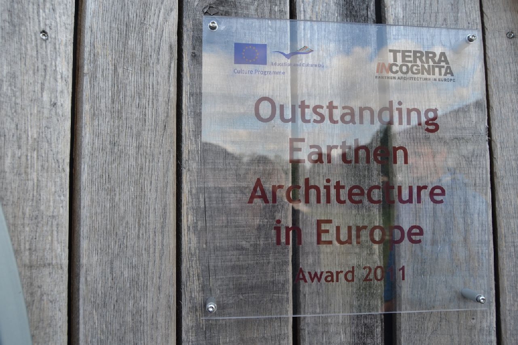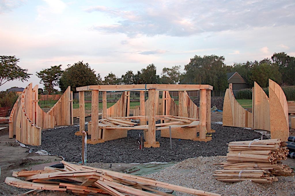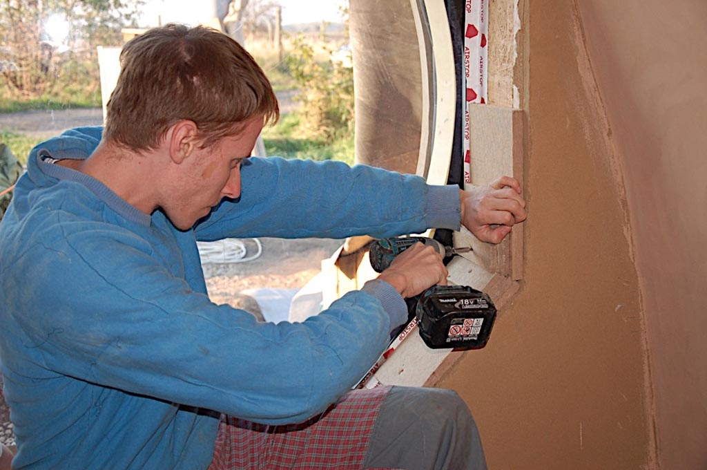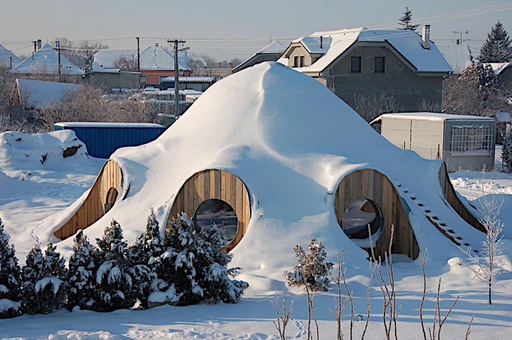 Nach Plänen von Prof. Gernot Minke und Arch. Zuzana Kierulvova, die auch Netzwerkerin (ArTUR) in der Slovakei ist entstand dieser Dom auf 5 lasttragenden Strohballen-Gewölben. Dabei wurde zuerst auf einem Schaumglasfundament eine OSB-Box mit Konstruktionsholz für die Fenster und Eingangstüre errichtet, dann tragende Rundhölzer, auf der die obere Kuppel ruht und danach wurden die Wände lasttragend als Gewölbe aufgemauert und mit Spannbändern vertikal und horizontal komprimiert. Dazu wurden die Ballen leicht konisch zugeschnitten. An der Innenseite wurde anschließend mit ca. 5-6 cm Lehm verputzt, an der Außenseite auf einer Lehm-Ausgleichsschicht eine EPDM-Teichfolie mit einem Gründach montiert. Bauphysikalisch also ein Wahnsinn, da außen eine Dampfsperre die Diffusion unterbindet. In der Realität aber funktioniert das prächtig. Bei einem Feuchtetest, zu dem auch das asbn anläßlich unseres Leonardo-Projektes eingeladen wurde, wurden an 2 Stellen der Kuppel die Folie aufgeschnitten und Messungen durchgeführt. Das Resultat war absolut überraschend: das Feuchtemessgerät zeigte an keiner Stelle – weder direkt unter der Folie noch im Stroh oder in der Lehmschicht – mehr als 10% rel. Feuchte an. Erklärbar ist das nur durch den Lehm, der bereits an der Innenseite der Wände so viel Feuchte anzieht, dass keine Feuchtigkeit in Form von Diffusion mehr in die Wand kann. Es lebe der Lehmputz!