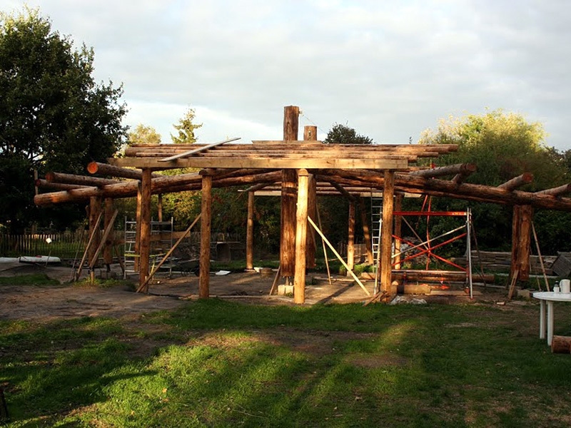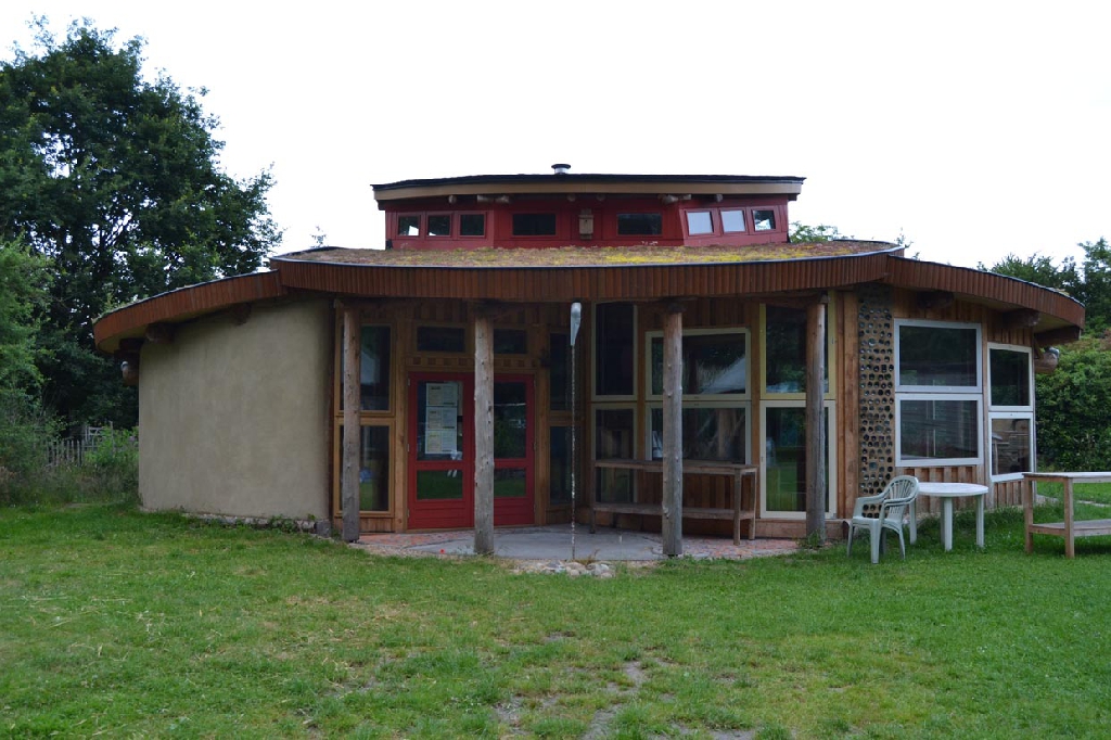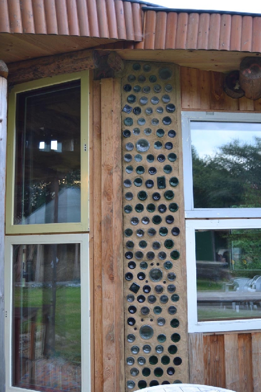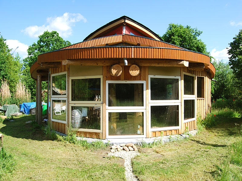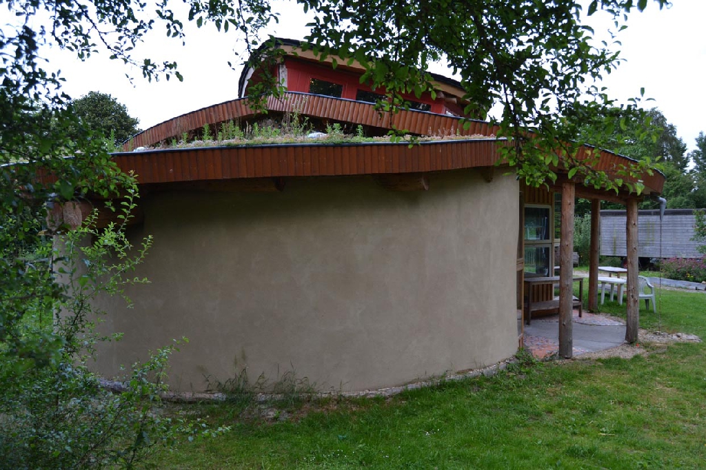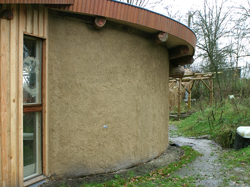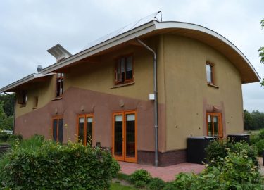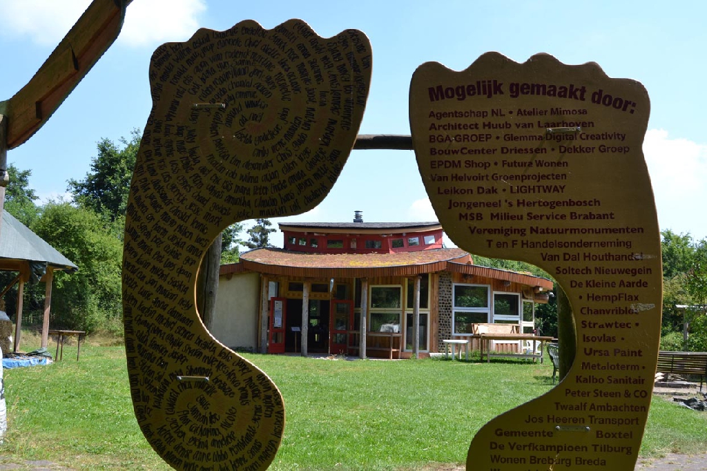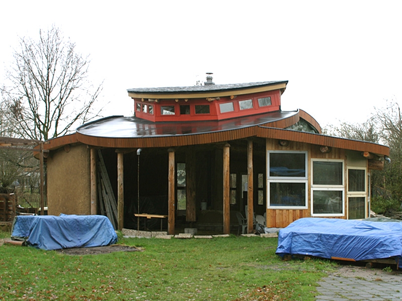 Dieses Strohballenhaus im Ecodorp Brabant in Boxtel wurde in Rundständerbauweise zum Teil im Rahmen von Workshops mit Wouter Klijn errichtet, dafür wurden auch Recyclingfenster und Flaschenwände verwendet. Das Dach besteht aus drei übereinandergelagerten Kreisen. Ein zentraler Masseofen (Rocket Stove) mit Lehmsitzbank beheizt das Gebäude.