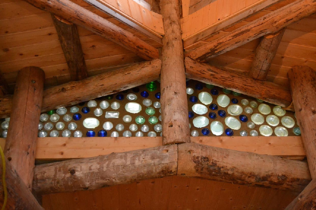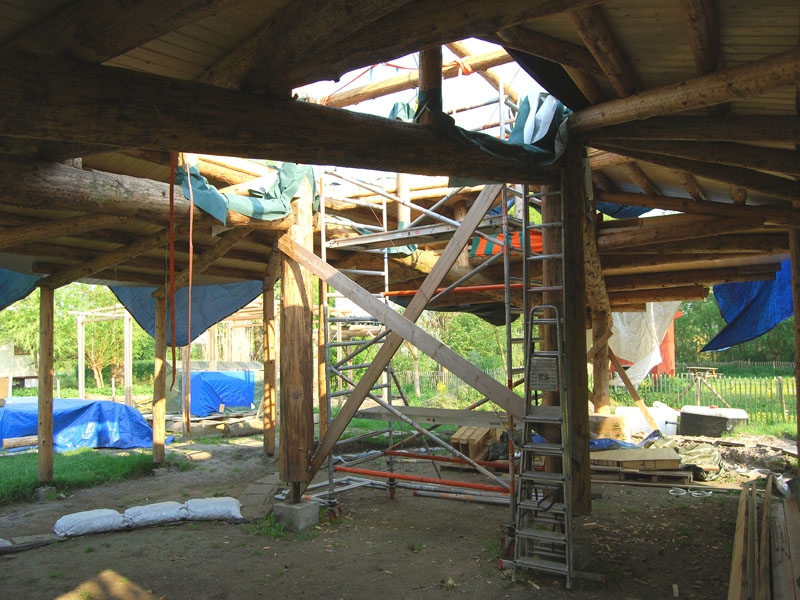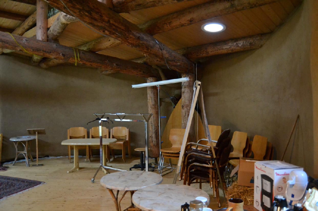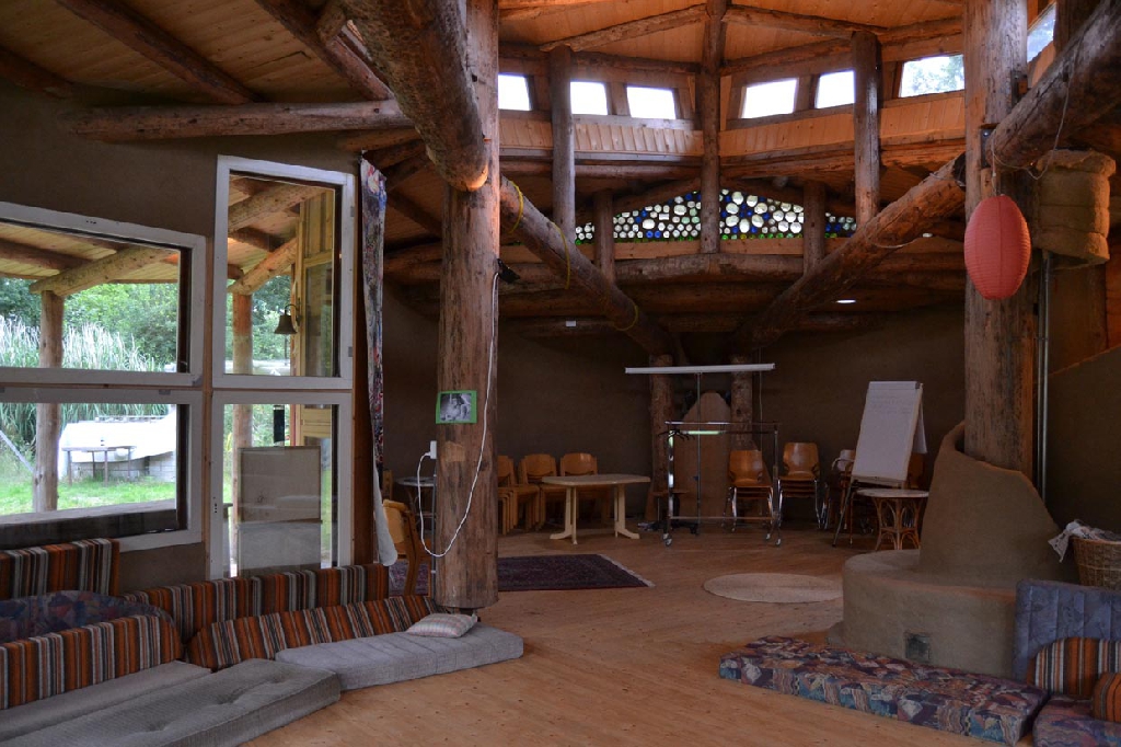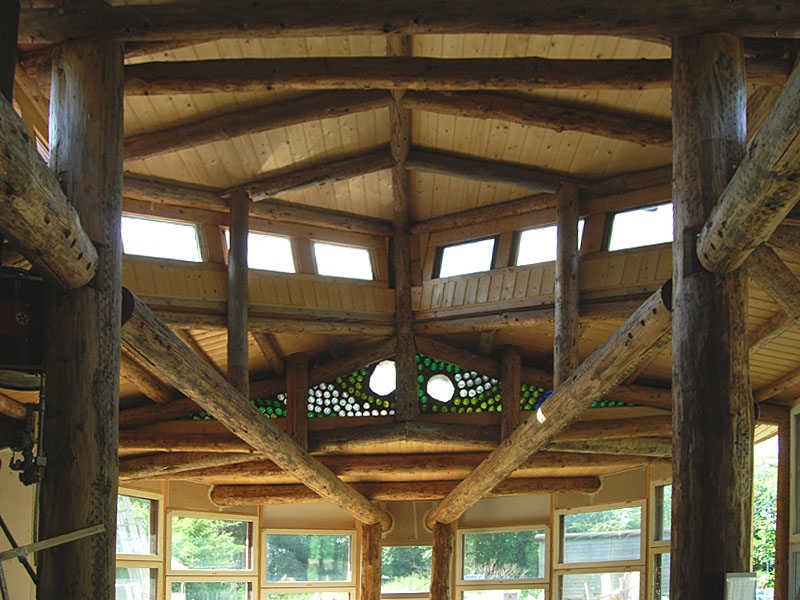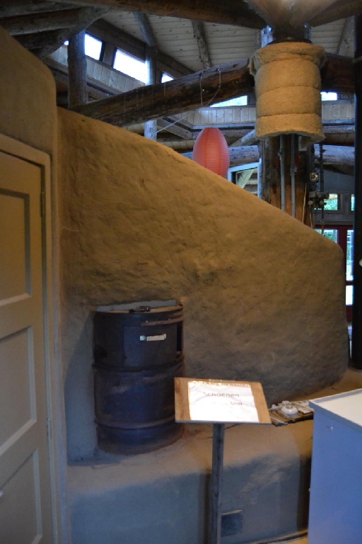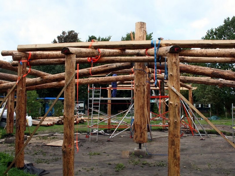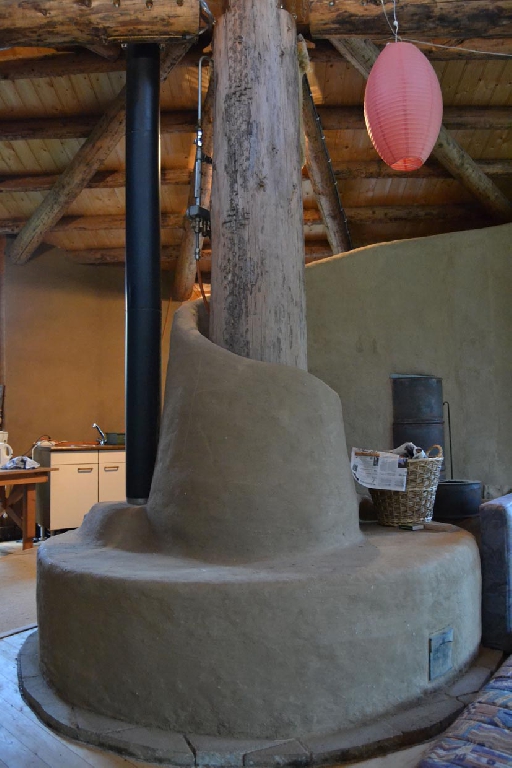 Dieses Strohballenhaus im Ecodorp Brabant in Boxtel wurde in Rundständerbauweise zum Teil im Rahmen von Workshops mit Wouter Klijn errichtet, dafür wurden auch Recyclingfenster und Flaschenwände verwendet. Das Dach besteht aus drei übereinandergelagerten Kreisen. Ein zentraler Masseofen (Rocket Stove) mit Lehmsitzbank beheizt das Gebäude.