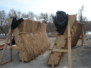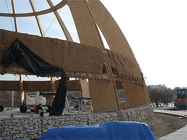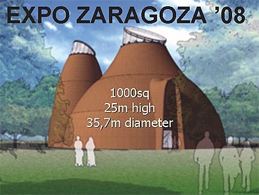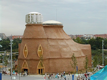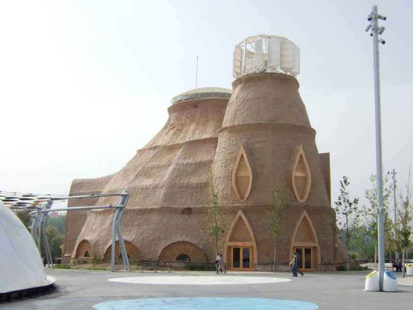 Mehr Bilder zur Konstruktion: In der offiziellen Beschreibung heißt es: Der Pavillon basiert auf Energieeffizienz, Recycling und Nachhaltigkeit. Beides – die Bauform wie seine Verwendung – basieren auf dem (Verdunstungs-/Kühlungs-)Prinzip des traditionellen Tonkrugs. Es wurden ausschließlich natürliche Materialien wie Stroh, Holz und Lehm verwendet.