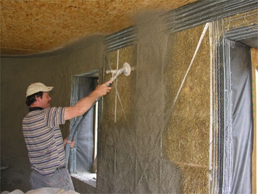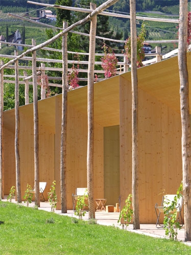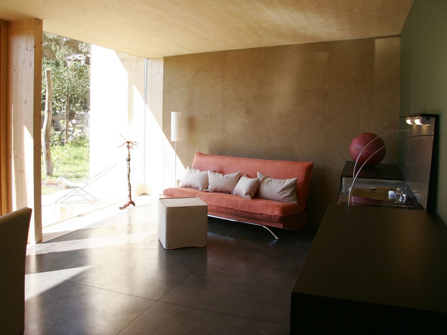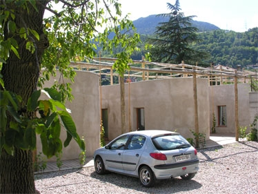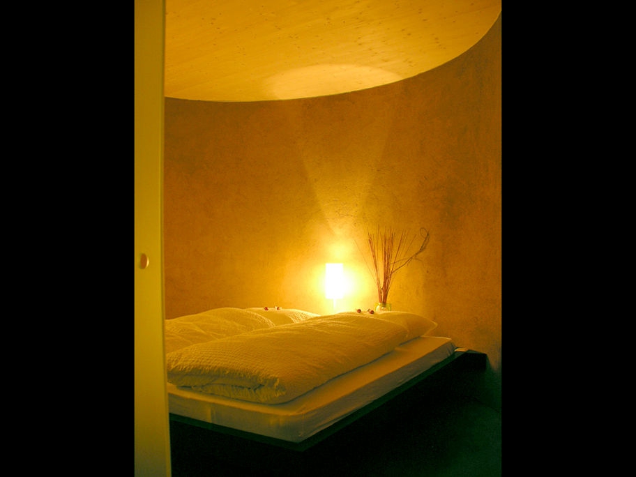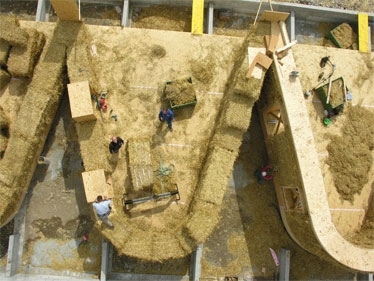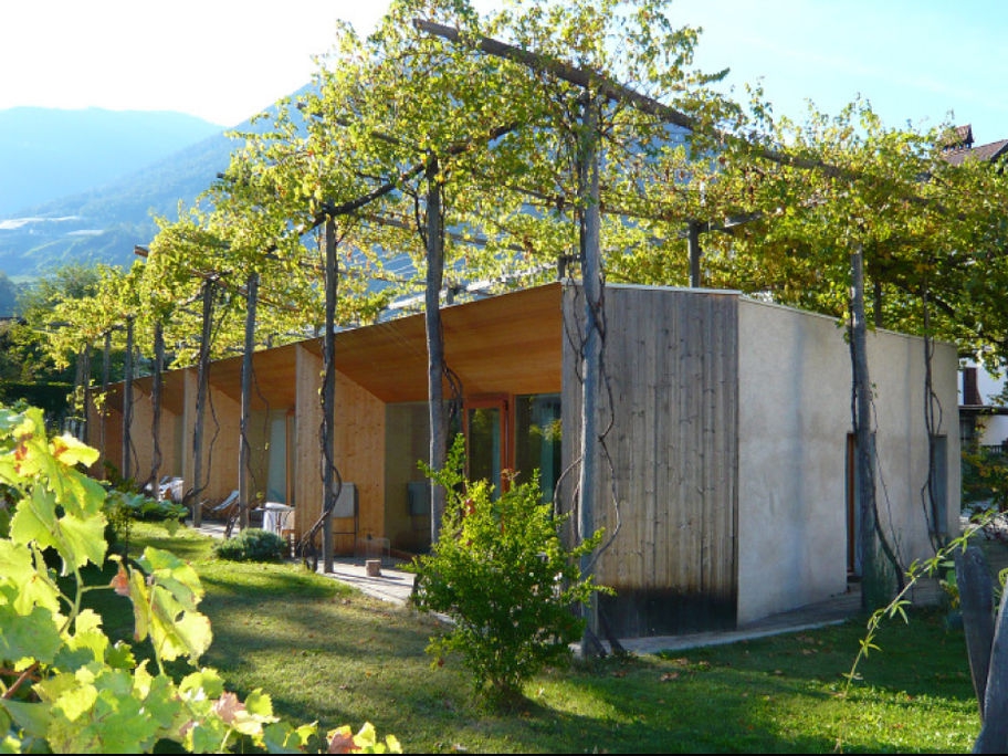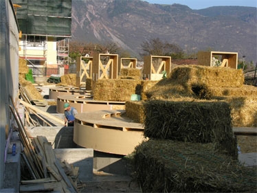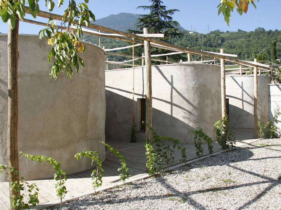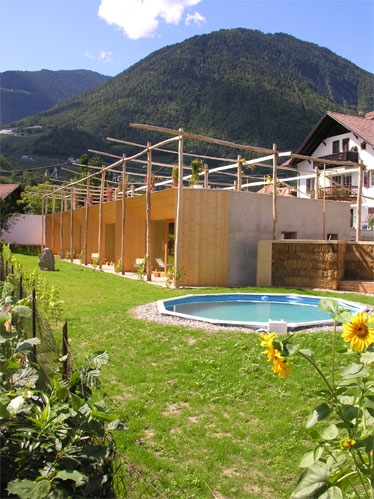 Lasttragende Strohballenbauweise mit Großballen, die direkt verputzt wurden. Auch die Bodenplatte ist mit Strohballen gedämmt. Das Dach liegt auf KLH-Platten (Kreuzlagenholz). Das Projekt erhielt den 2. Preis beim Südtiroler Architekturpreis 2007.
