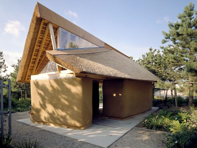 Anlässlich der Floriade 2002 in Holland wurde dieses lasttragende Strohballen-Gebäude als Muster-Pavillon mit Schilfdach von Martin Oehlmann errichtet.