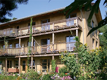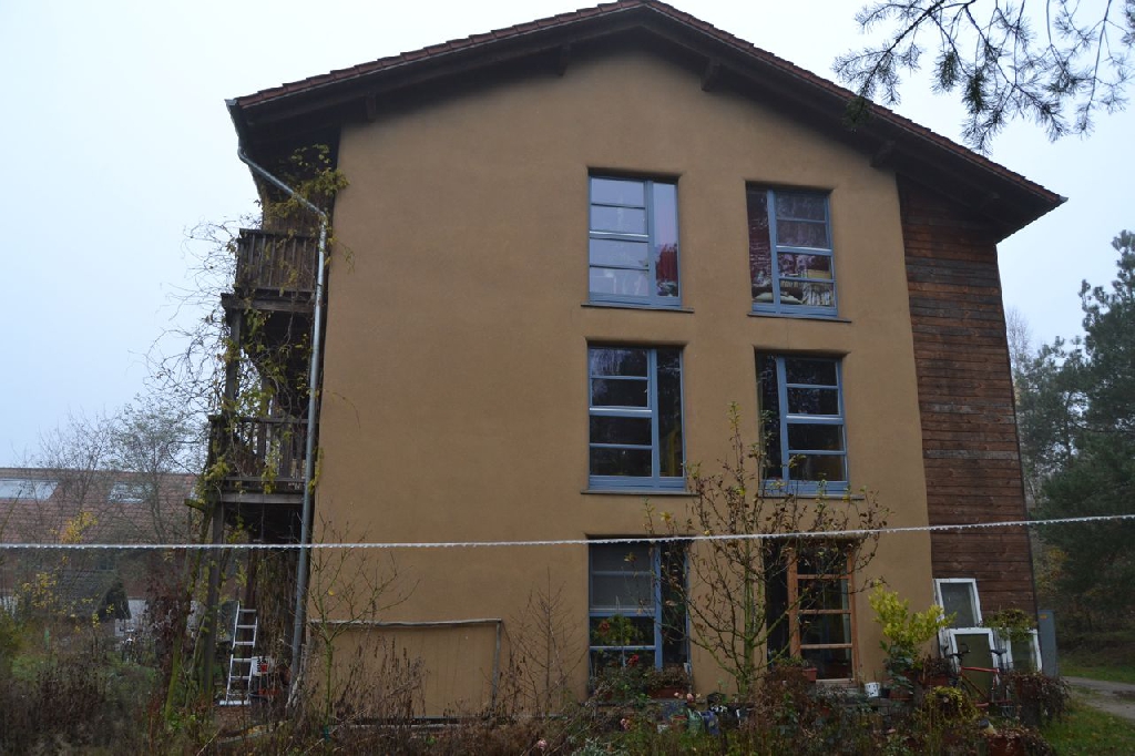 Dreigeschoßiges Gemeinschafts-Wohnhaus in Sieben Linden / Poppau, Altmark, Sachsen-Anhalt, in Holzständerbauweise errichtet. Trotz der hohen bauaufsichtlichen Anforderungen an ein Mehrfamilienhaus (Brandschutz) wird mit dem vorliegenden Projekt der Beweis angetreten, dass mit der verputzten Strohballen -Ständerbaukonstruktion auf umweltfreundliche Weise kostengünstiger, verdichteter, gesunder Wohnraum geschaffen werden kann, der modernen Anforderungen gerecht wird. Weitere Info: