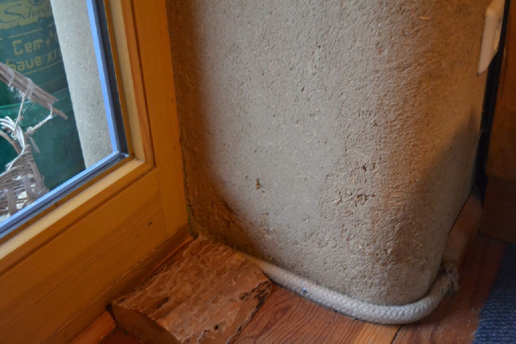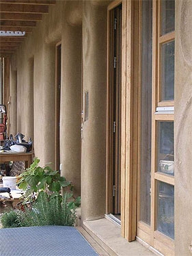 Wandaufbau: Holzständer im Abstand von 1,5-3,5m, horizontale Brettriegel im Abstand von 1m, dazwischen kleine Strohballen, Innen Lehmputz 3cm, Außen Lehmputz 3cm