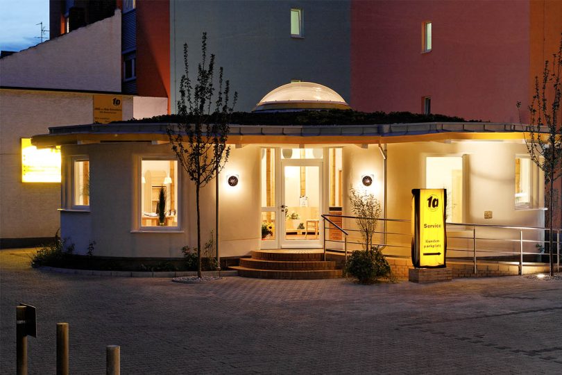 Strohballen-Bürogebäude für eine Autowerkstatt, Bambusstützen mit Strohballenfassade, Strohballen- & Lehmbau: Cato Räuchle und (lokale) Bauhelfer. Fotos: Shakti Haus