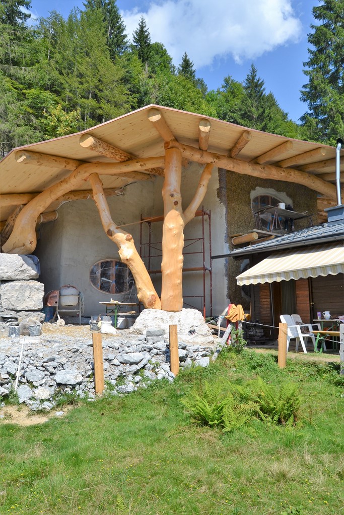 In den Salzburger Bergen auf 1100 m Seehöhe entstand ein „Hobbithaus“ mit Gründach. Die bis zu 6,5 m hohen Wände wurden unter Mithilfe der Baufamilie und Freunden im Sommer 2016 in CUT-Technik auf Steinfundamenten errichtet, mit Strohballen gedämmt und beidseitig verputzt (Kalk und Lehm).