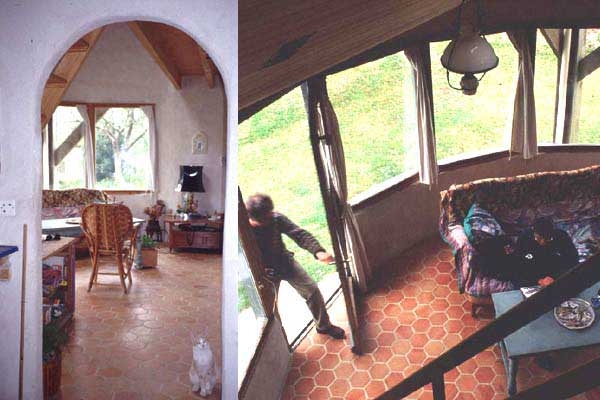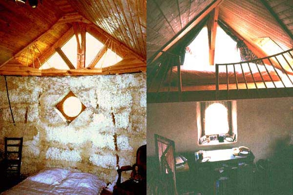 In Gagné-Technik (mortared strawbale – Strohballen im Zementgitter) und vorgesetzter Holzständerbauweise errichtetes Gebäude mit runden Mauern. Auch wenn heute – wegen der vielen Wärmebrücken – nicht mehr so gebaut wird, ist dieses schon fast historische Gebäude ein Beispiel für die Vielfalt der Strohballenbau-Techniken. Und interessant ist hier vor allem die von den (lasttragenden Strohballenwänden losgelöste Konstruktion, mit der man solche lasttragenden Gebäude leicht statisch berechnen und bewilligen lassen kann. Bilder unten (Pascal Thepaut, Martin Oehlmann): Ein Blick auf die unverputzte Strohballenwand im Schlafzimmer (links) zeigt die Gagné-Technik. Die Bauweise ist übrigens wegen der Wärmebrücken durch das Zementgitter umstritten. Holzständerbauweise gemischt mit Gagné-Technik (Strohballen ohne Versatz mit Zement aufgemauert): Blick in den Innenraum des von Pascal Thepaut errichteten Gebäudes in der Bretagne.