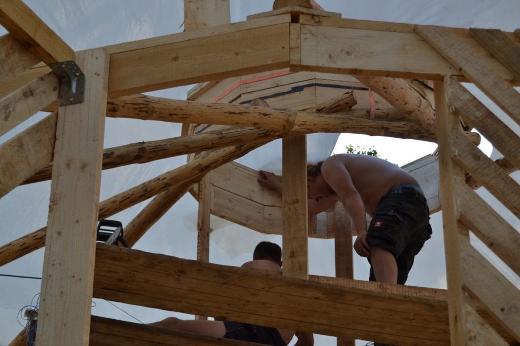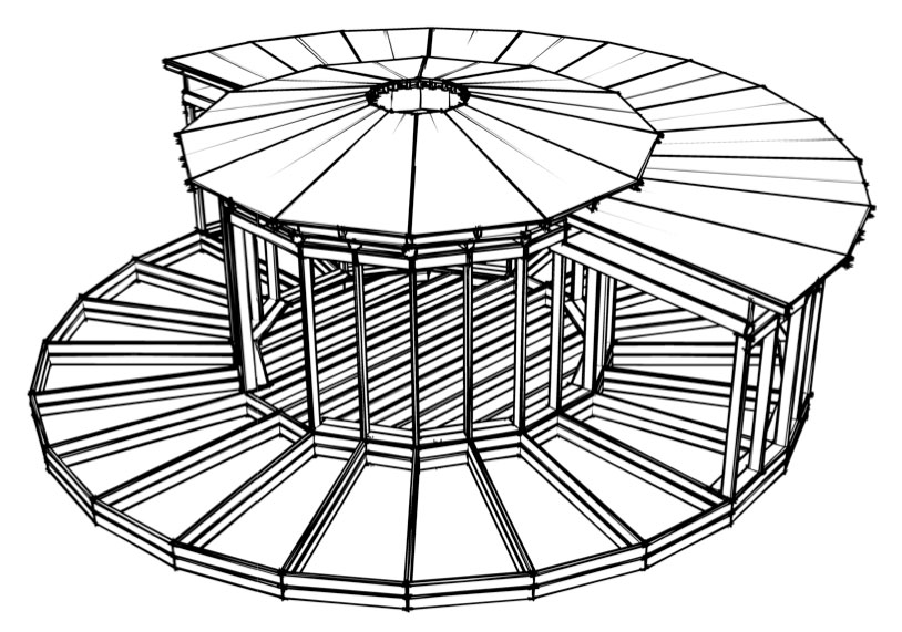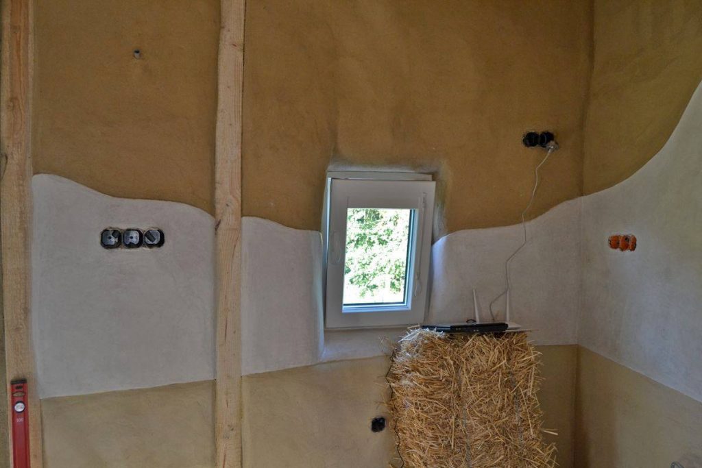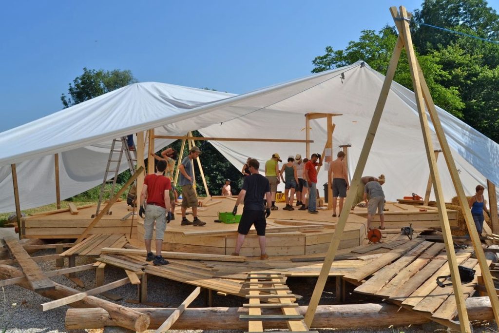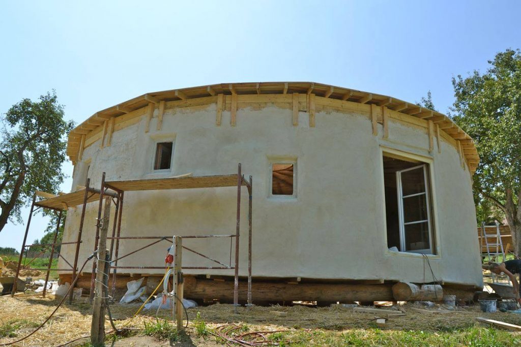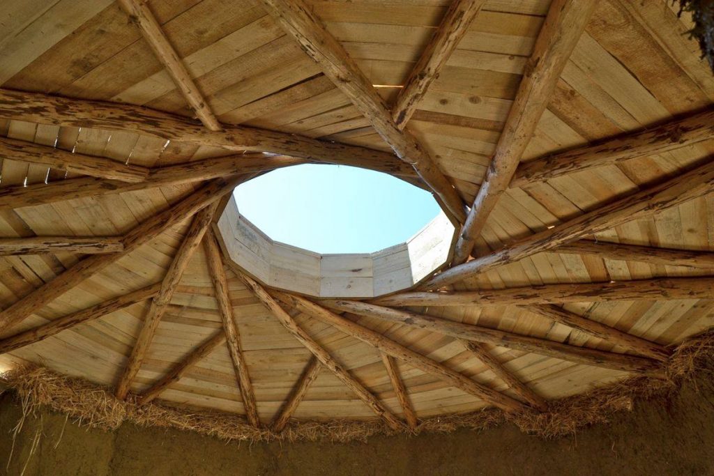 LowCost Rundhaus-Projekt mit reziprokem Dach, Strohballen gedämmter Bodenplatte, Wänden und reziprokem Dach, Diagonalschalung, Schilfstukkatur und Lehm-/Kalkputz.