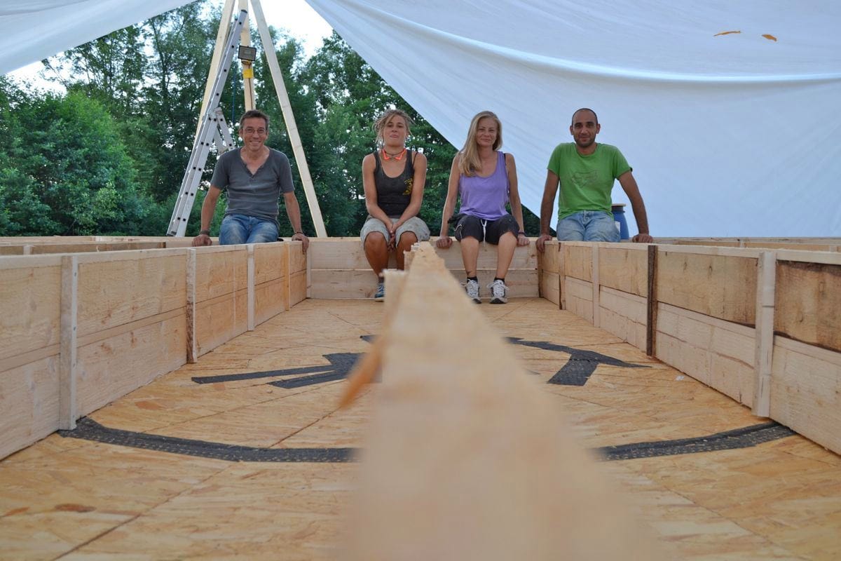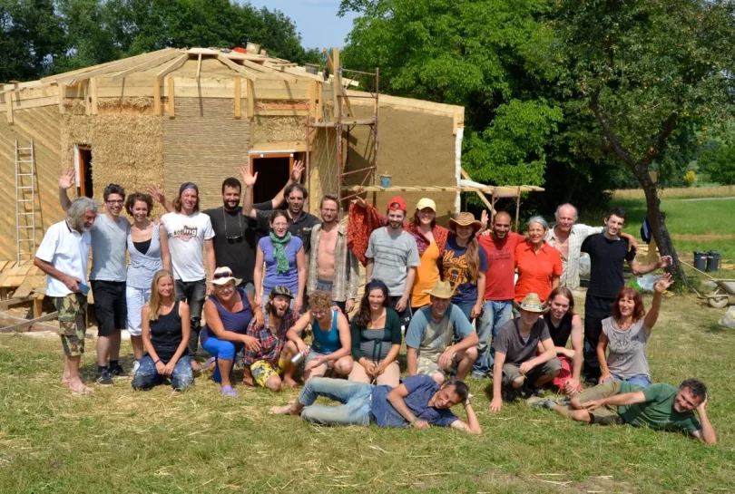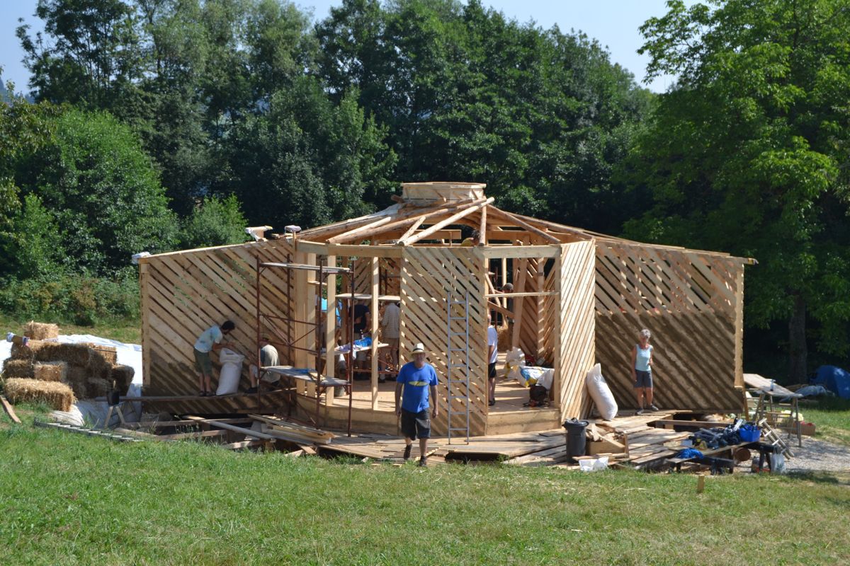 LowCost Rundhaus-Projekt mit reziprokem Dach, Strohballen gedämmter Bodenplatte, Wänden und reziprokem Dach, Diagonalschalung, Schilfstukkatur und Lehm-/Kalkputz.