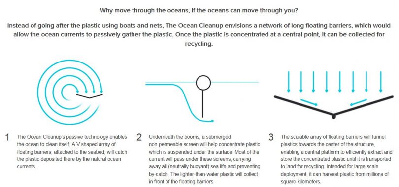 Woche für Woche wird Plastik mit dem Volumen von zwei Empire State Buildings in den Ozean gekippt, der „Plastic Planet“ ist in Form von Kunststoffmüll-Inseln bereits Realität. Da kommen solch gute Nachrichten gerade recht: Wirklich verblüffend, was Boyan Slat, mit 20 der jüngste Gewinner des UN-Umweltawards aller Zeiten, entwickelt hat. The Ocean Cleanup (der Meeresputz) sammelt passiv den Plastikmüll durch strategisch platzierte Barrieren unter Ausnutzung der Meeresströmungen.
