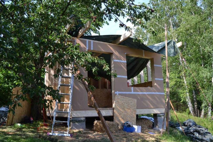 Atelier (Nebengebäude) komplett mit Holzständer-Konstruktion und Bodenplatte auf vorbereiteten Punktfundamenten im Rahmen eines ASBN-Workshops errichtet.