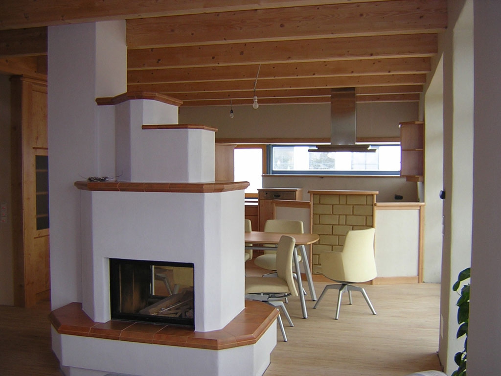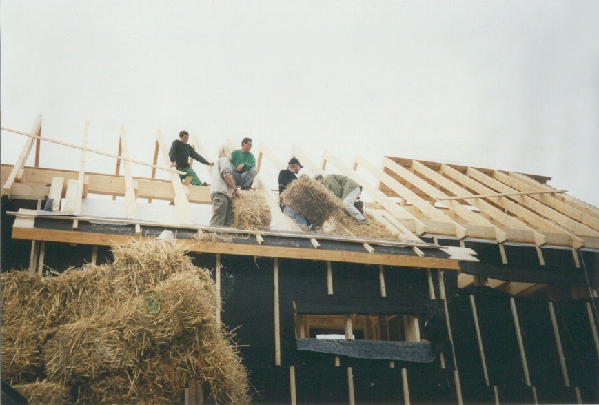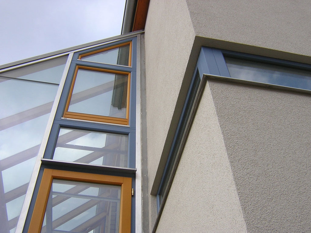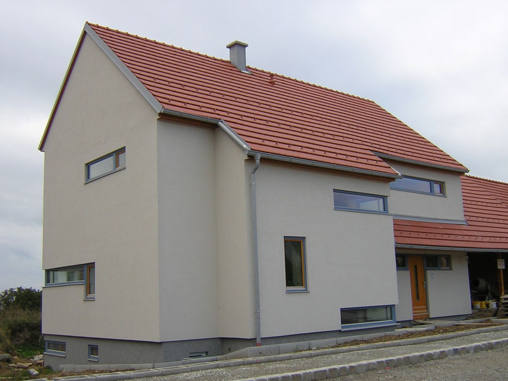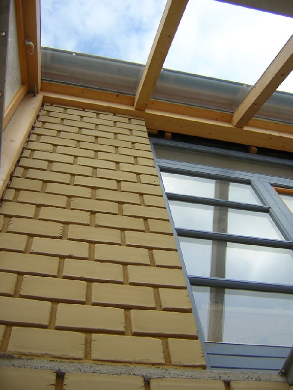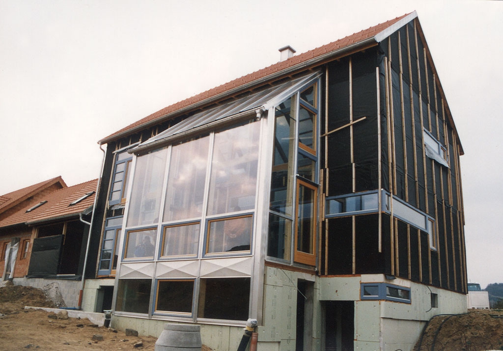 Strohballenhaus in Doppelständer-System mit massiven Lehmziegel-Innenwänden als thermische Speicher, auch hinter dem Wintergarten