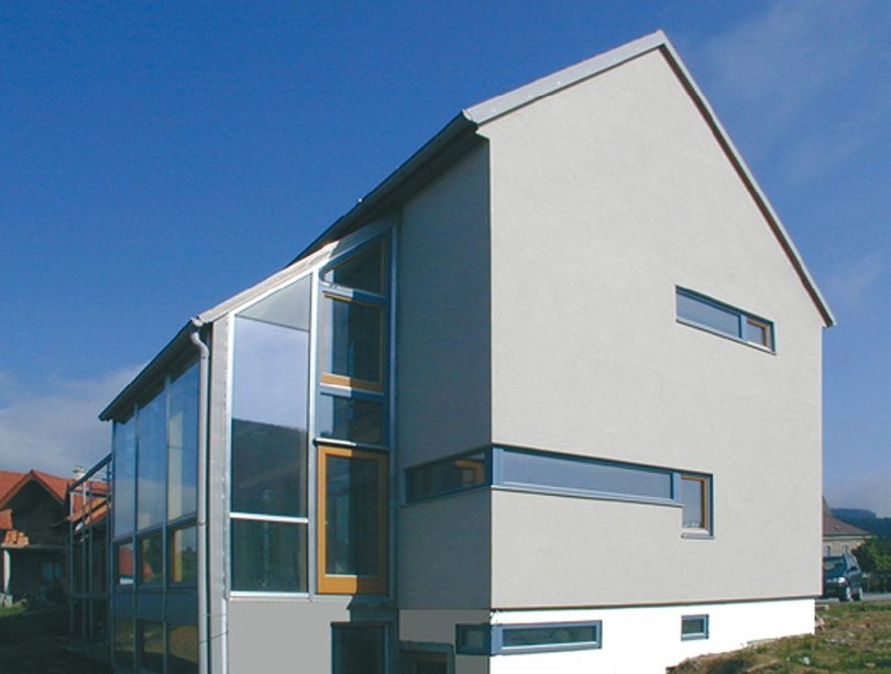 Strohballenhaus in Doppelständer-System mit massiven Lehmziegel-Innenwänden als thermische Speicher, auch hinter dem Wintergarten