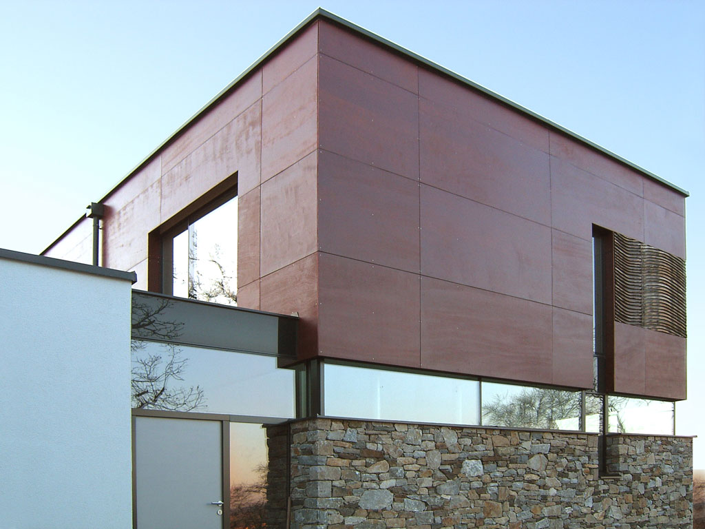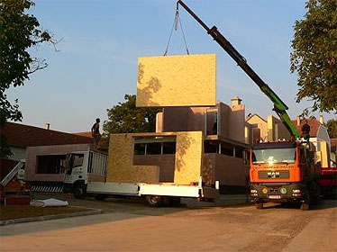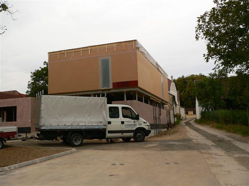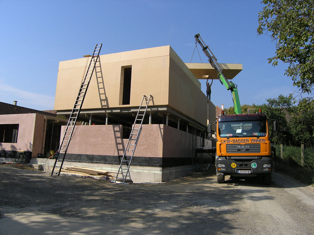 Bei diesem Einfamilienhaus wurden die Wandelemente des Obergeschosses mit 35 cm und die Dachkonstruktion mit 50 cm Weizenstrohballen gedämmt. Anerkennung für vorbildliches Bauen in NÖ.
