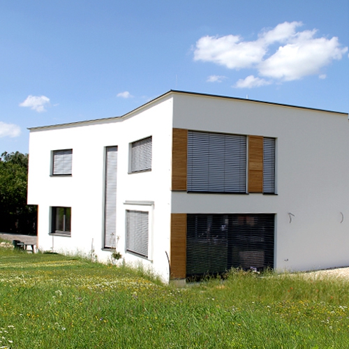 Massives Ziegelhaus (25 cm) mit 36 cm Strohballenfassade als „Vollwärmeschutz“ und Flachdach. Hanglage mit behindertengerechtem Eingang zur Ordination im Untergeschoß, der südöstliche Gebäudeteil wurde um 30° Richtung Süden abgewinkelt. Alle Fenster und Terrassentüren sind mit Holz-Schiebeläden als Sonnenschutz ausgestattet.