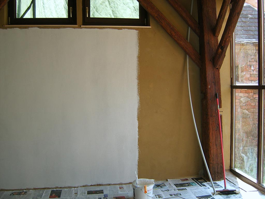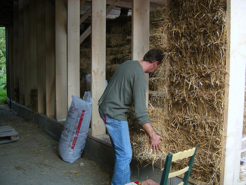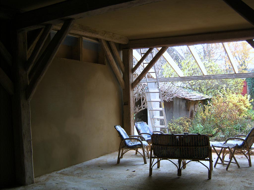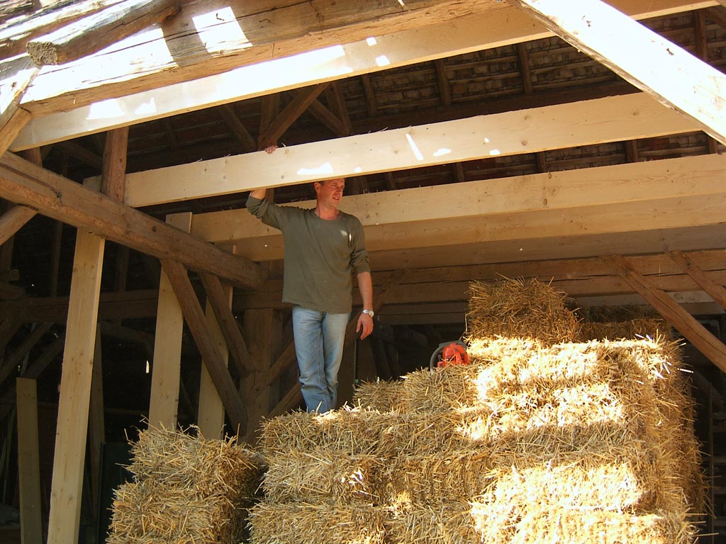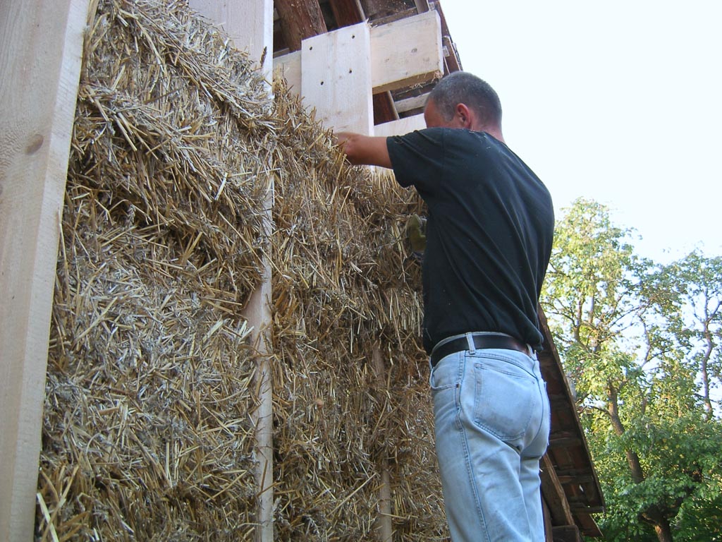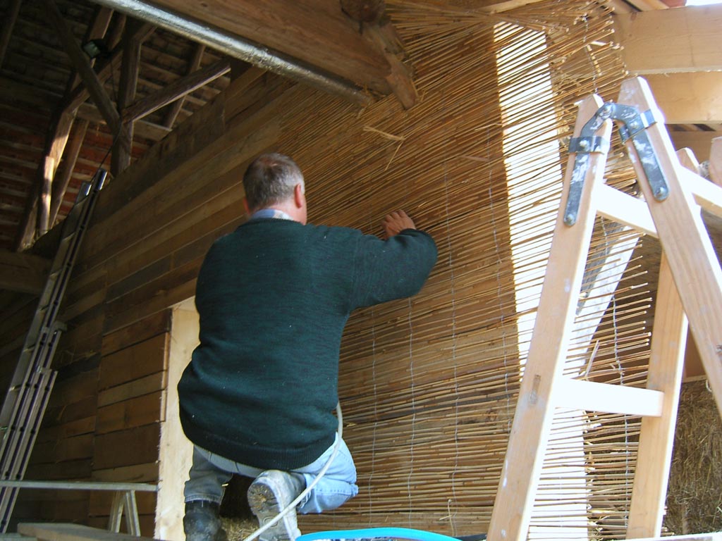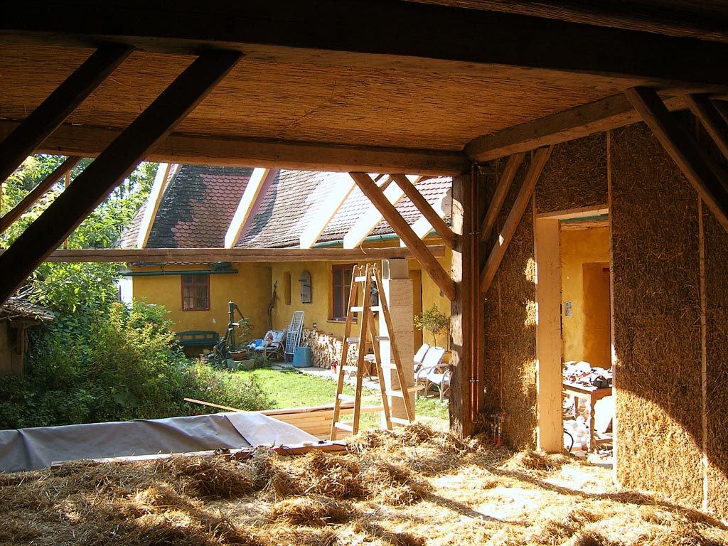 Dazu wurde nach der Entmantelung der alten Scheune zuerst ein Streifenfundament aus Betonsteinen errichtet, auf dem – außerhalb der wunderbaren alten Holzkonstruktion – die Strohballenwände (24 cm Miniballen) zwischen 4 x 24 cm Ständern und Sparren befüllt. Außen wurde mit einer diffusionsoffenen Agepanplatte beplankt und mit Kalk bzw. Lehm (unter der Terrassenüberdachung) verputzt, innen wurde mit 2-4 cm Lehm direkt auf die Ballenwände verputzt. Die Elektroleitungen laufen Oberputz. Als Boden wurde ein Estrich mit Fussbodenheizung auf Perlit (Europerl) und Schotter verlegt. Die Decke zum damals unausgebauten Dachboden wurde an der Unterseite mit Rauschalung und Schilfstukkatur verplankt und danach ebenso mit Lehm verputzt. Abschließend wurde mit einer diffusionsoffenen Kalkfarbe geweißelt.
