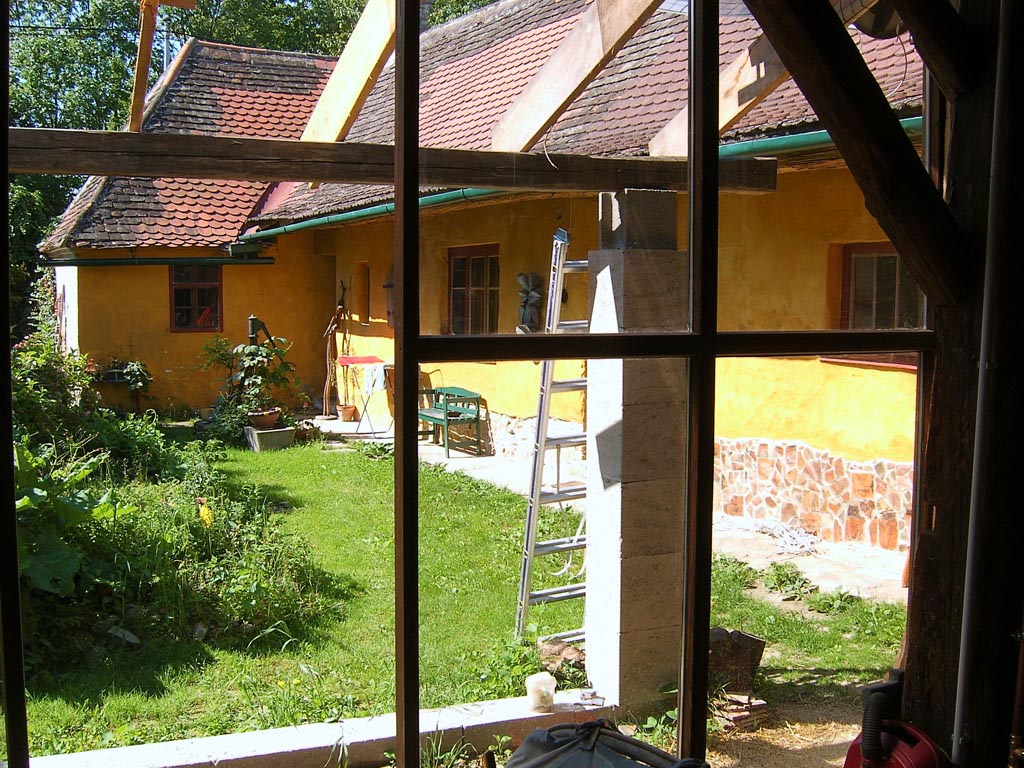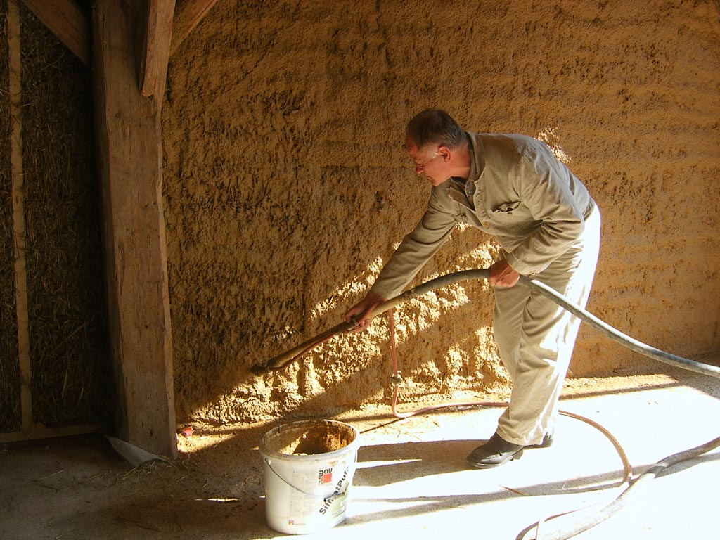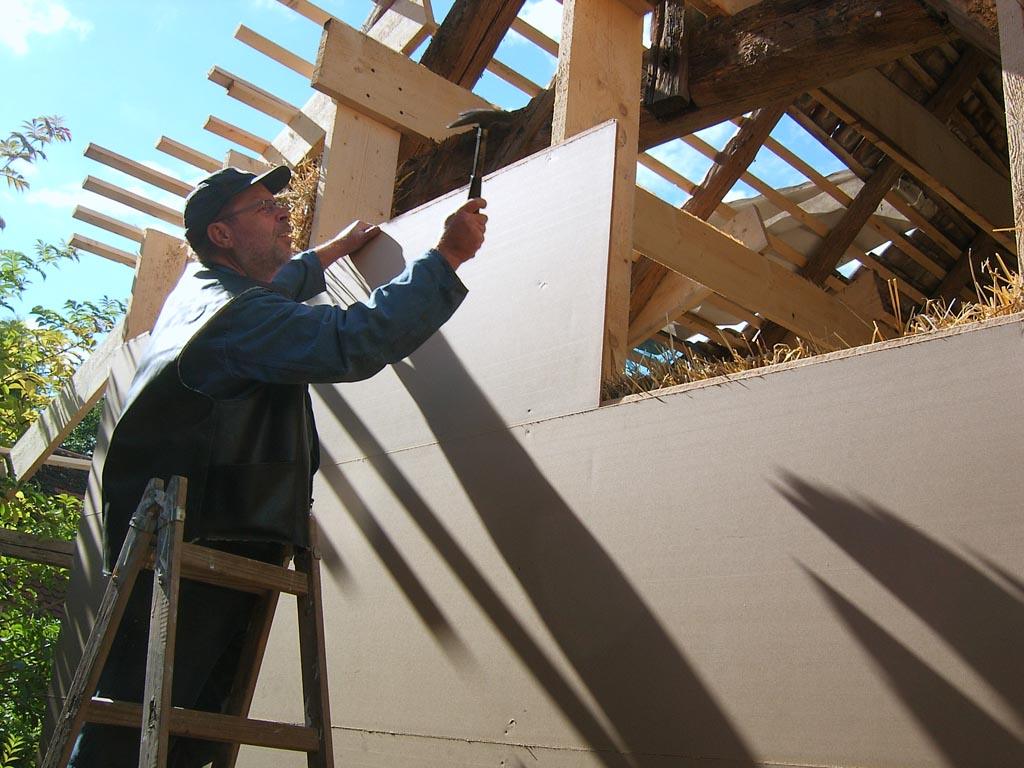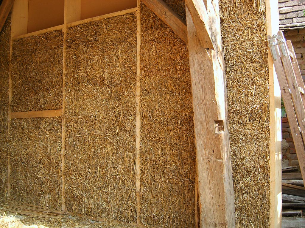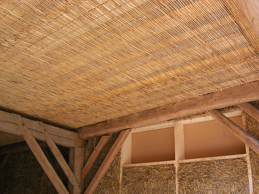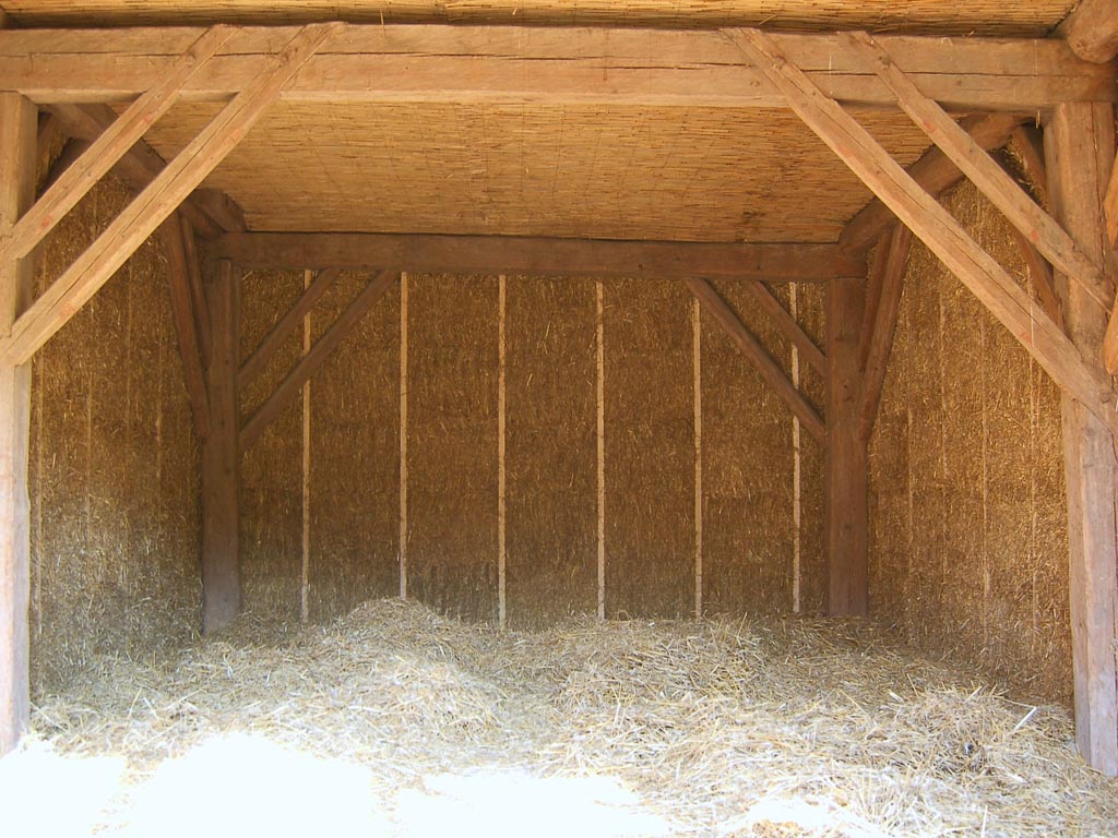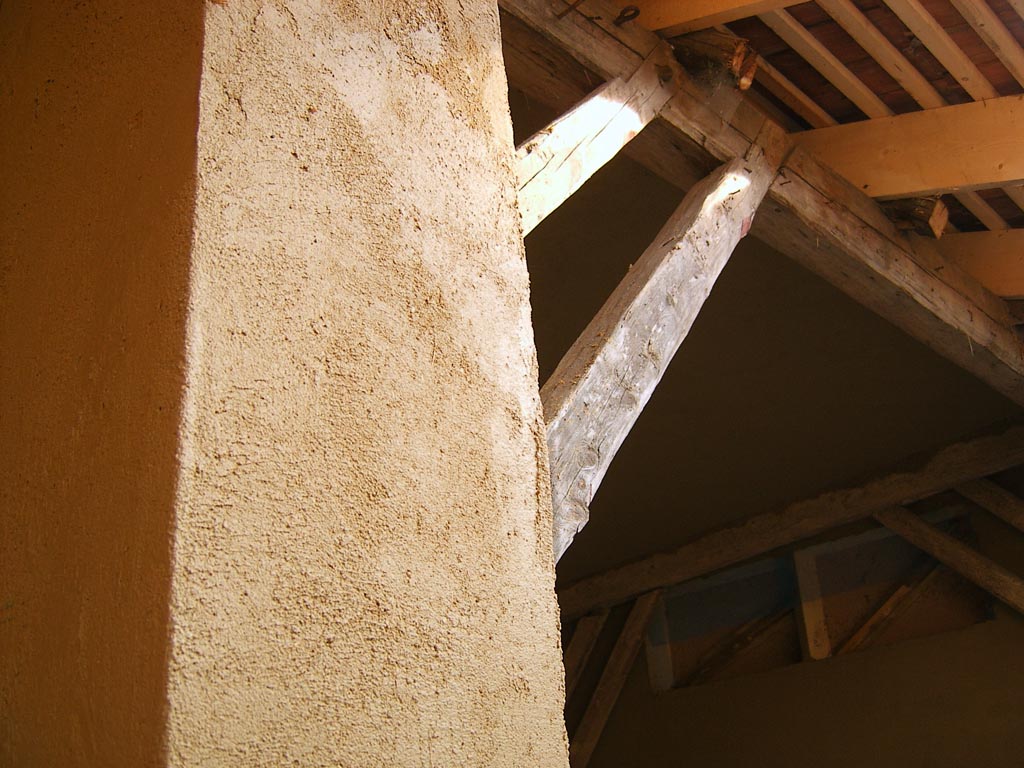 Dazu wurde nach der Entmantelung der alten Scheune zuerst ein Streifenfundament aus Betonsteinen errichtet, auf dem – außerhalb der wunderbaren alten Holzkonstruktion – die Strohballenwände (24 cm Miniballen) zwischen 4 x 24 cm Ständern und Sparren befüllt. Außen wurde mit einer diffusionsoffenen Agepanplatte beplankt und mit Kalk bzw. Lehm (unter der Terrassenüberdachung) verputzt, innen wurde mit 2-4 cm Lehm direkt auf die Ballenwände verputzt. Die Elektroleitungen laufen Oberputz. Als Boden wurde ein Estrich mit Fussbodenheizung auf Perlit (Europerl) und Schotter verlegt. Die Decke zum damals unausgebauten Dachboden wurde an der Unterseite mit Rauschalung und Schilfstukkatur verplankt und danach ebenso mit Lehm verputzt. Abschließend wurde mit einer diffusionsoffenen Kalkfarbe geweißelt.