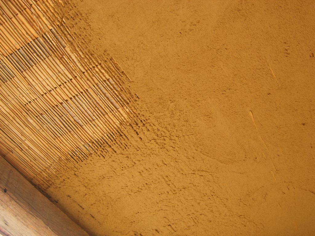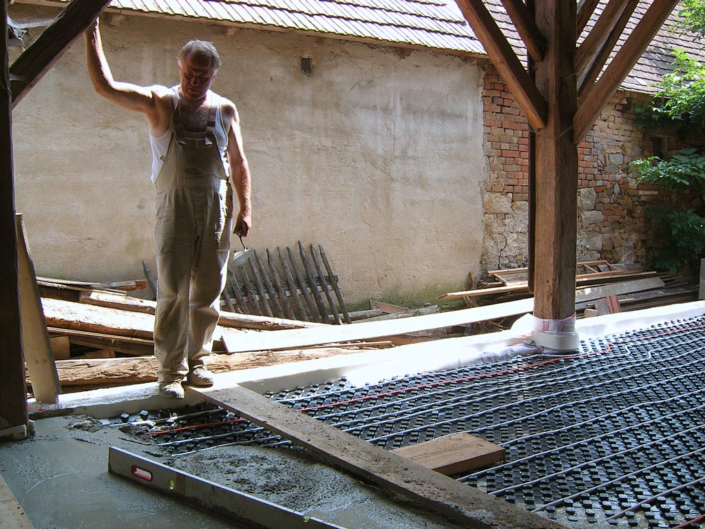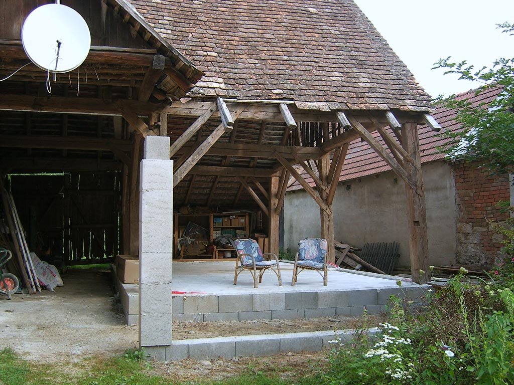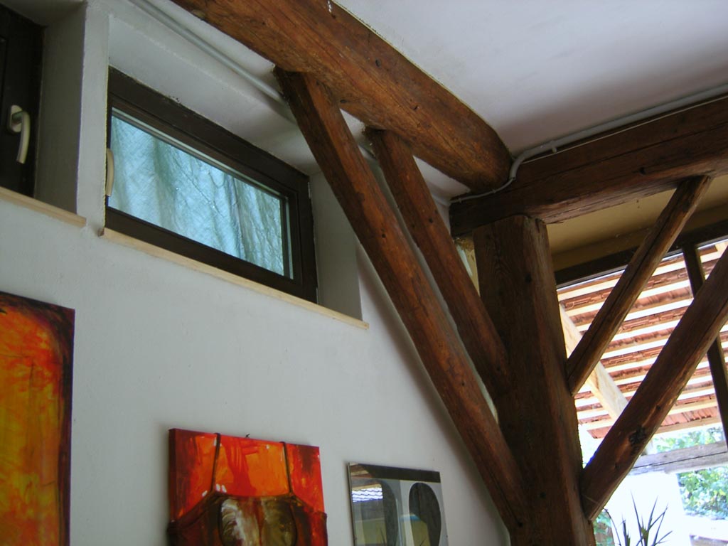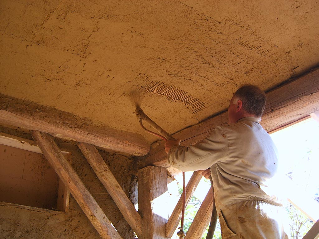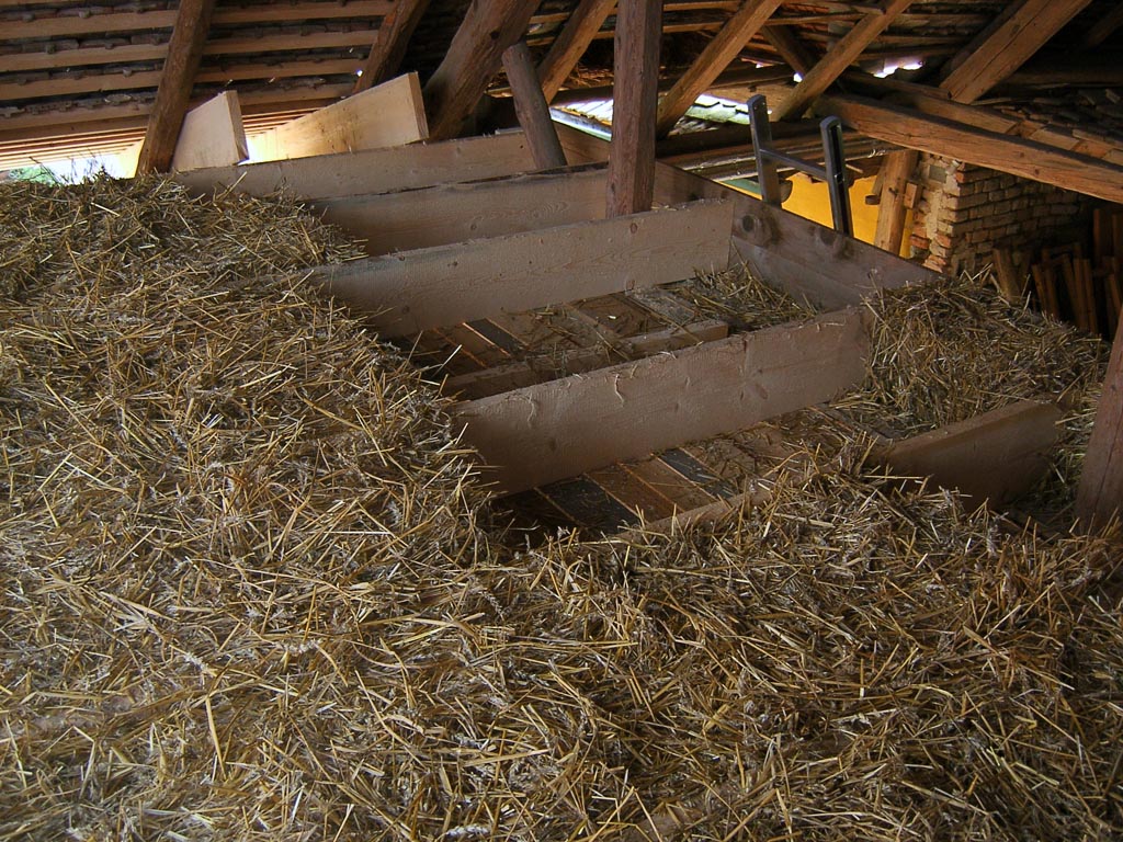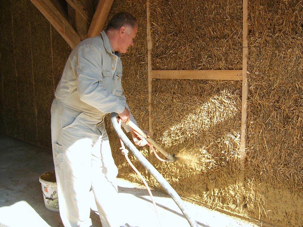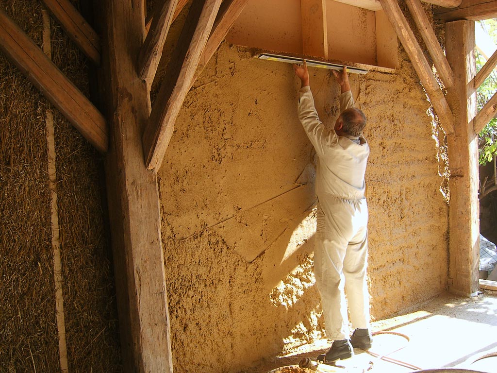 Dazu wurde nach der Entmantelung der alten Scheune zuerst ein Streifenfundament aus Betonsteinen errichtet, auf dem – außerhalb der wunderbaren alten Holzkonstruktion – die Strohballenwände (24 cm Miniballen) zwischen 4 x 24 cm Ständern und Sparren befüllt. Außen wurde mit einer diffusionsoffenen Agepanplatte beplankt und mit Kalk bzw. Lehm (unter der Terrassenüberdachung) verputzt, innen wurde mit 2-4 cm Lehm direkt auf die Ballenwände verputzt. Die Elektroleitungen laufen Oberputz. Als Boden wurde ein Estrich mit Fussbodenheizung auf Perlit (Europerl) und Schotter verlegt. Die Decke zum damals unausgebauten Dachboden wurde an der Unterseite mit Rauschalung und Schilfstukkatur verplankt und danach ebenso mit Lehm verputzt. Abschließend wurde mit einer diffusionsoffenen Kalkfarbe geweißelt.