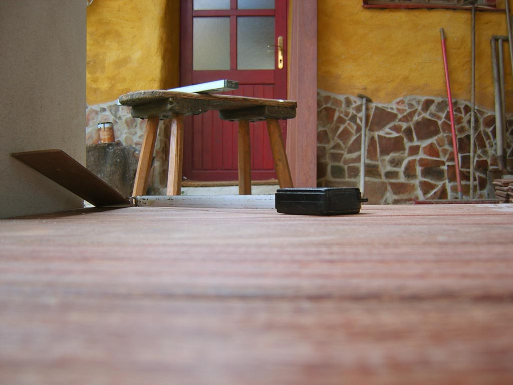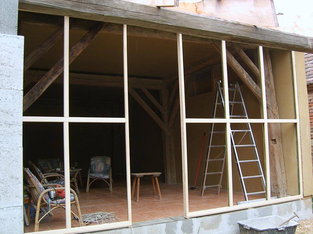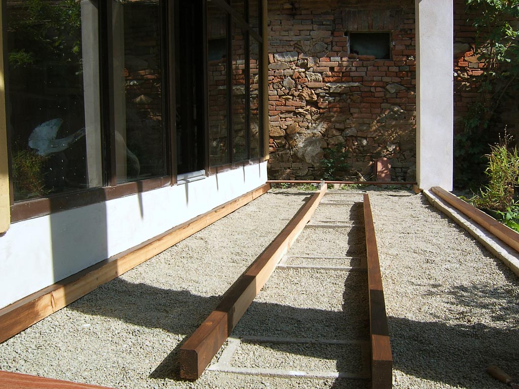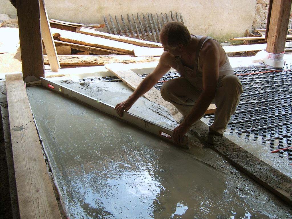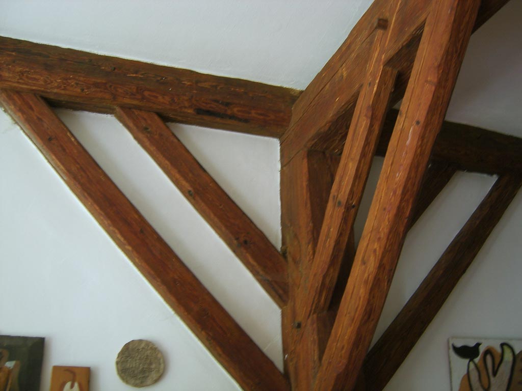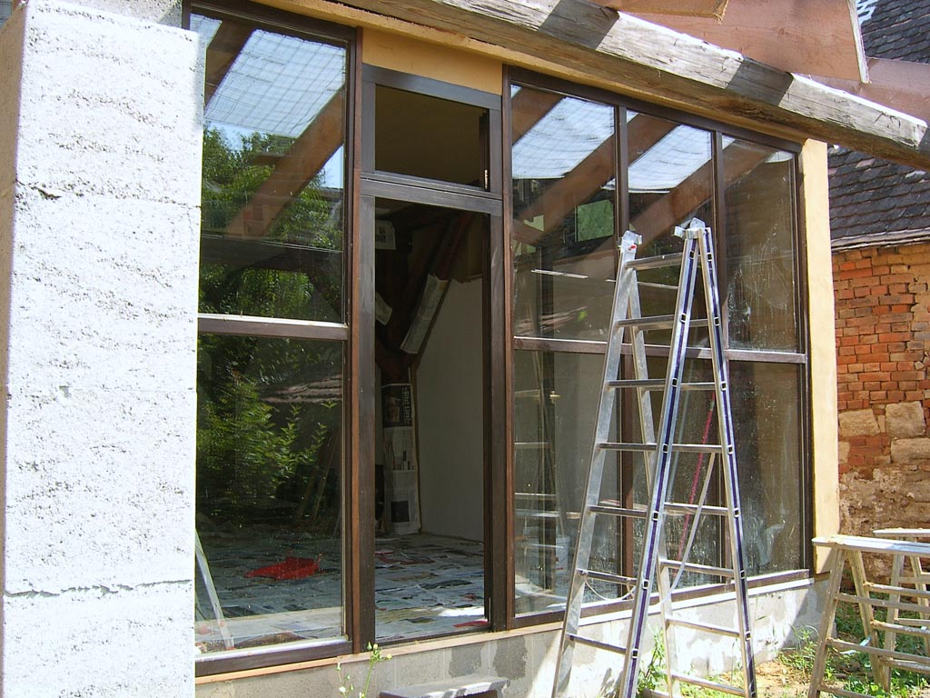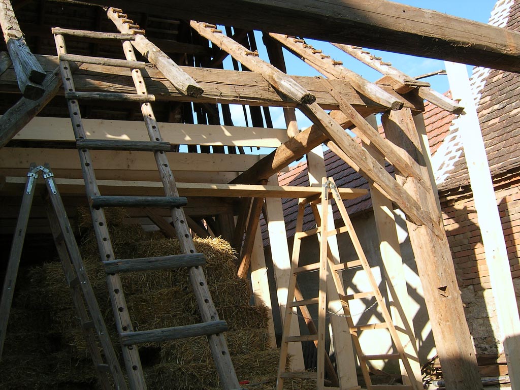 Dazu wurde nach der Entmantelung der alten Scheune zuerst ein Streifenfundament aus Betonsteinen errichtet, auf dem – außerhalb der wunderbaren alten Holzkonstruktion – die Strohballenwände (24 cm Miniballen) zwischen 4 x 24 cm Ständern und Sparren befüllt. Außen wurde mit einer diffusionsoffenen Agepanplatte beplankt und mit Kalk bzw. Lehm (unter der Terrassenüberdachung) verputzt, innen wurde mit 2-4 cm Lehm direkt auf die Ballenwände verputzt. Die Elektroleitungen laufen Oberputz. Als Boden wurde ein Estrich mit Fussbodenheizung auf Perlit (Europerl) und Schotter verlegt. Die Decke zum damals unausgebauten Dachboden wurde an der Unterseite mit Rauschalung und Schilfstukkatur verplankt und danach ebenso mit Lehm verputzt. Abschließend wurde mit einer diffusionsoffenen Kalkfarbe geweißelt.