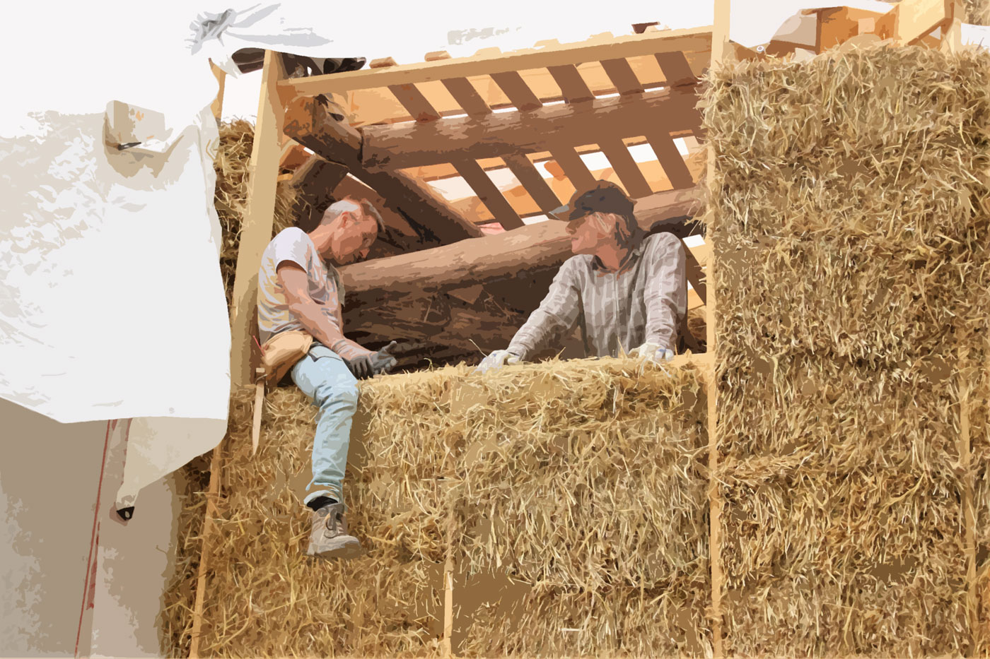 StrohNatur-Leistungen: Errichten einer (nicht tragenden) CUT-Konstruktion rund um die bestehende Tragstruktur, Strohballen einfüllen, Verputzen (Lehm & Kalk)