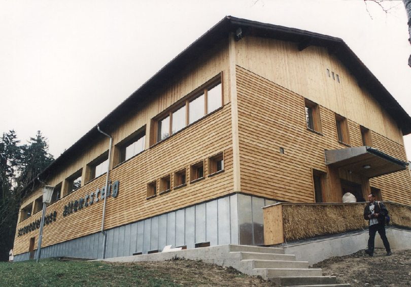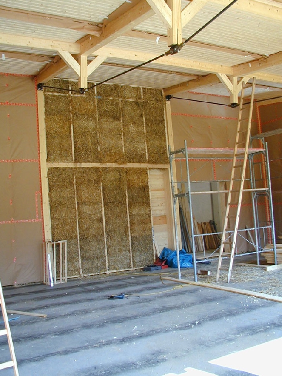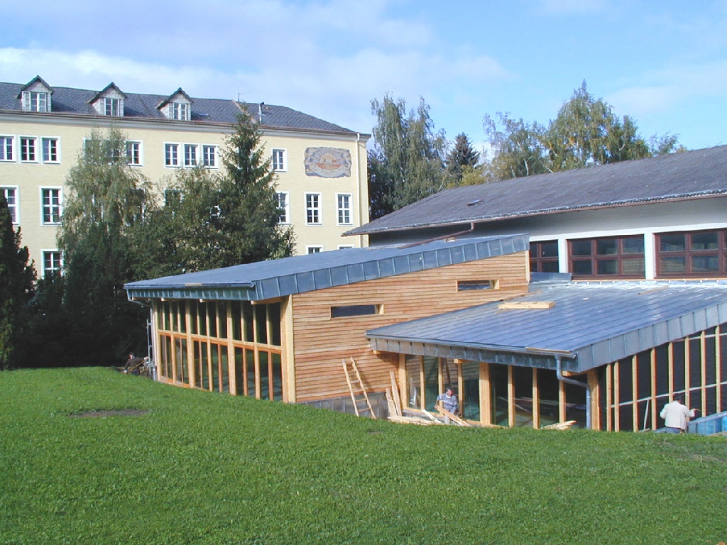 Strohballengedämmter Turnsaalzubau in einer öffentlichen Schule, von Ing. Wolfgang Tillich beim Amt der NÖ Landesregierung geplant. Fotos: Ing. Wolfgang Tillich, Herbert Gruber/asbn (letztes Bild)