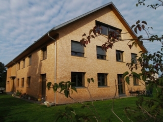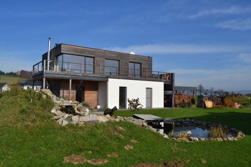 Passivhaus mit Strohdämmung. Wohnbereich im Obergeschoss, Schlafräume im Erdgeschoss, keine Hanglage. Nurglasecke, Fassade aus Lärchenholz.