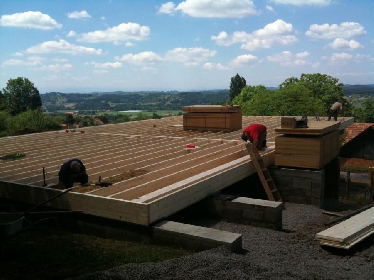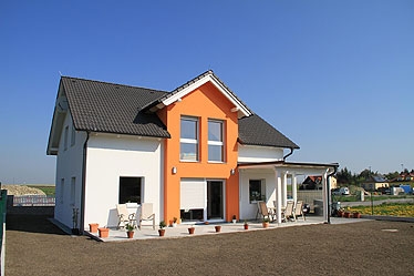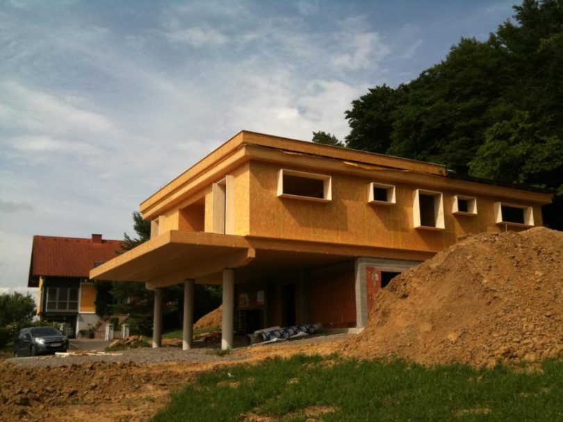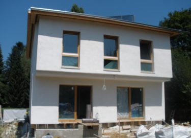 Hier hat die steirische Firma Stroh & Lehm (Robert Knapp und Virko Kade) eine interessante Konstruktion errichtet: Eine tragende Holzriegelkonstruktion wird mit strukturell aussteifenden OSB-Platten beplankt, Fenster- und Türboxen werden ebenfalls aus OSB-Platten gefertigt (Bild oben). Danach werden außen die Strohballen vorgesetzt, wie im lasttragenden Strohballenbau verdichtet, mit Fassadenankern befestigt und direkt verputzt (Bilder unten). Auch die Bodenplatte auf Streifenfundament wurde mit Strohballen gedämmt.