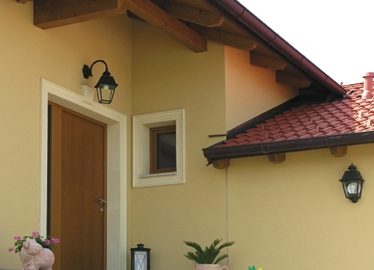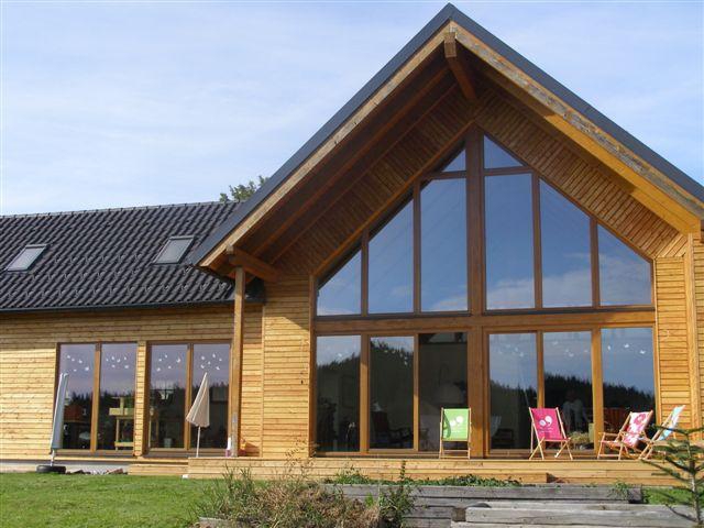 Niedrigenergiehaus in vorgefertigter Holzriegelkonstruktion, das als Büro und Wohnhaus dient. Die Wände wurden mit OSB und Heraklithplatten (Installationsebene) innen beplankt und danach mit Lehm verputzt, an der Außenseite wurde eine hinterlüftete Holzfassade auf diffusionsoffenen DWD Platten montiert, zusätzlich wurde teilweise eine Winddichtigkeitsfolie aufgebracht. Das Dach wurde vor Ort mit Strohballen zwischen den Sparren gedämmt. Fotos: KreativerHolzbau