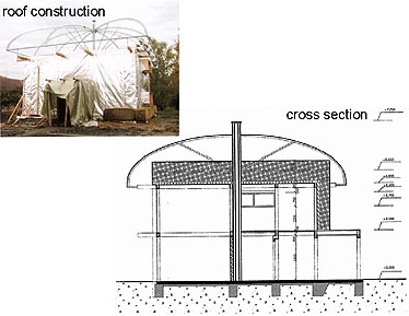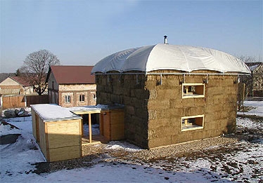 Experimentalgebäude „Umbrella House“ (Schirmhaus) mit abgehobenem textilen Dach und unverputzer Strohballenfassade vor einem massiven Gebäudekern aus Ziegeln. Das Gebäude hat, obwohl es bewußt nie verputzt wurde, erstaunlich gut dem Wetter standgehalten, in neueren Aufnahmen sieht man lediglich etwas Moos an den exponierten Strohballenwänden (was doch auf etwas höhere Feuchtigkeit hindeutet). Die fehlende Winddichtigkeit wird den Dämmwert wahrscheinlich auf die Hälfte reduzieren. Durch die mittelgroßen 60cm Ballen wird das wahrscheinlich wieder ausgegelichen.