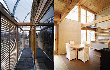 Architekt Petr Suske: „The supporting frame consists of a wooden skeleton and a brick core. The wooden structure is walled with a fifteen-centimeter wall made of unburnt bricks, which creates accumulation and has a positive effect on the microclimate in the interior. The outer layer of thermal insulation on the perimeter shell – separated from the clay wall by vapor barrier – is stacked from bales of straw, chemically treated against combustion„. Als unkonventionelle Konstruktion können wir hier den Hightech-„Regenschirm“ bezeichnen, d. h. ein Textilgewebe auf einem Metallgerüst, das die Funktion eines Daches erfüllt.