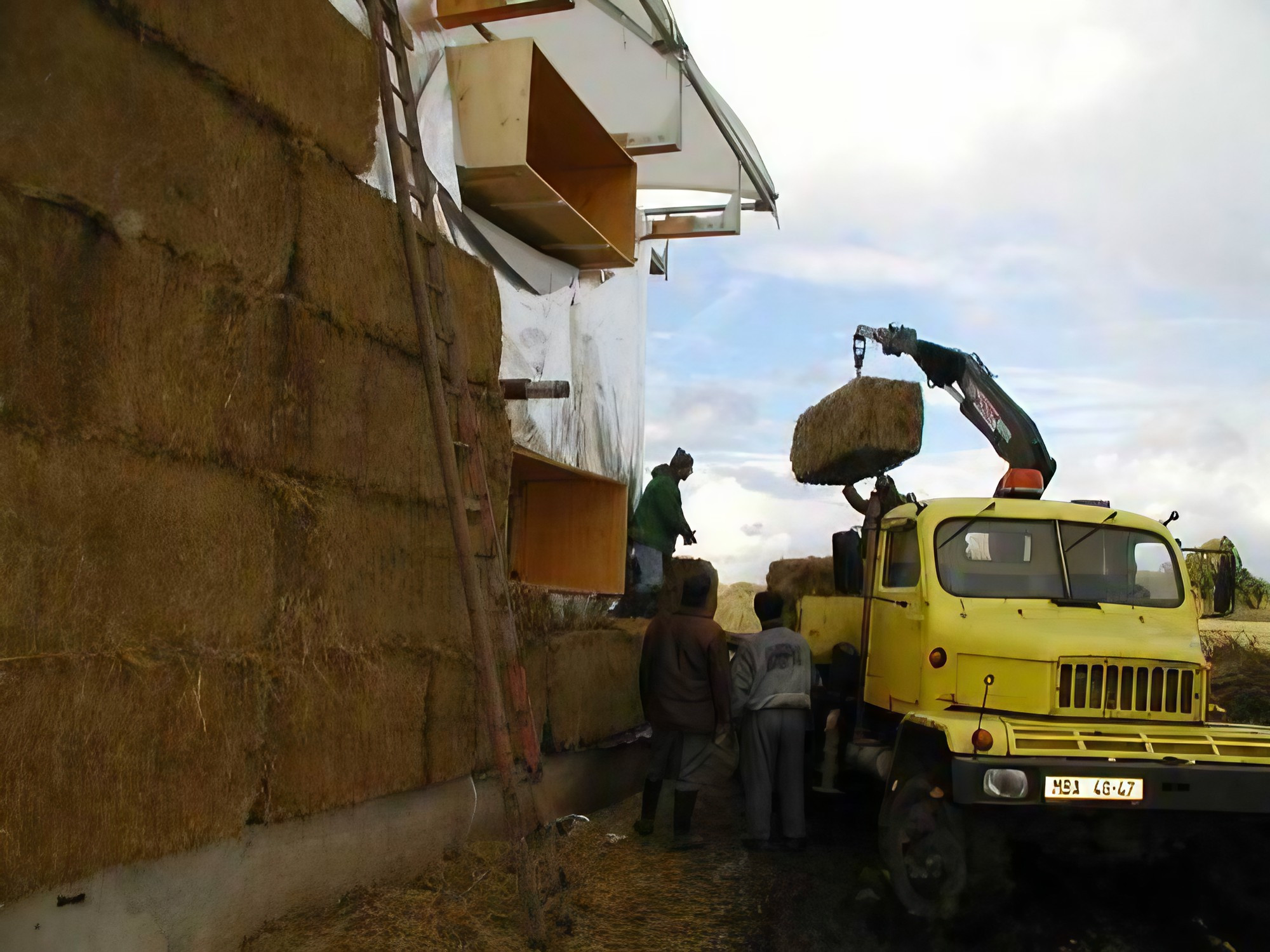 Experimentalgebäude „Umbrella House“ (Schirmhaus) mit abgehobenem textilen Dach und unverputzer Strohballenfassade vor einem massiven Gebäudekern aus Ziegeln. Das Gebäude hat, obwohl es bewußt nie verputzt wurde, erstaunlich gut dem Wetter standgehalten, in neueren Aufnahmen sieht man lediglich etwas Moos an den exponierten Strohballenwänden (was doch auf etwas höhere Feuchtigkeit hindeutet). Die fehlende Winddichtigkeit wird den Dämmwert wahrscheinlich auf die Hälfte reduzieren. Durch die mittelgroßen 60cm Ballen wird das wahrscheinlich wieder ausgegelichen.