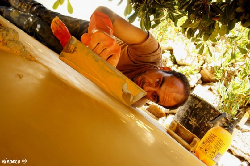 Tadelakt total: Eine Terrasse auf Kreta wird mit einer speziellen Mischung oberflächenbehandelt – Kalkputz, angereichert mit Olivenölseife und Leinsamenöl, gefärbt mit gelbem Ocker.