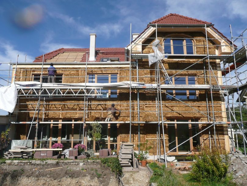 Das Dachgeschoss wurde komplett rückgebaut. Das neue Dach wurde steiler aufgestellt, die neue Raumhöhe beträgt nun bis zu 3,2 m. Die bestehenden Außenwände wurden mit Strohballen gedämmt und mit Kalk verputzt. Ein Teil der Fassade hat eine sägerauhe Fichtenschalung erhalten. Aufgrund des Dachüberstandes sowie der Orientierung nach Süden und Osten bekommt die Holzschalung wenig Regen ab und hat mittlerweile einen wunderbaren warmen Farbton. Sowohl nach Norden als auch nach Süden hat das Haus einen kleinen Anbau in klassischer Holzständer-Strohballenkonstruktion bekommen. Die neuen Fenster und Haustüren sind aus geölter Eiche gefertigt und haben 3-Scheiben-Verglasung.