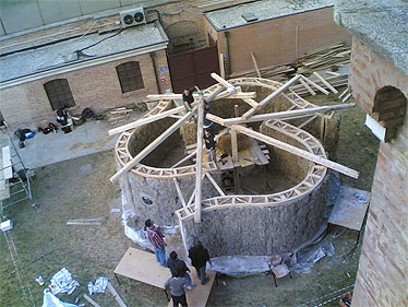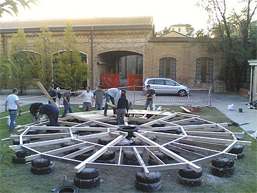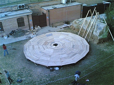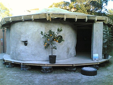 Lasttragender kleiner Demonstrations-Strohballenbau auf Autoreifen-Fundament mit geschwungenen Wänden, in einem Workshop der italienischen Strohballen-Netzwerks LaBoa mit Studenten errichtet. Wirkt witzig, aber dieser kleine Bau zeigt sehr deutlich, wie so ein Gebäude auf Autoreifen und Bodenplatte mit Fußschwelle und Ringanker kostengünstig und einfach errichtet werden kann. Fotos: LaBoa, Stefano Soldati